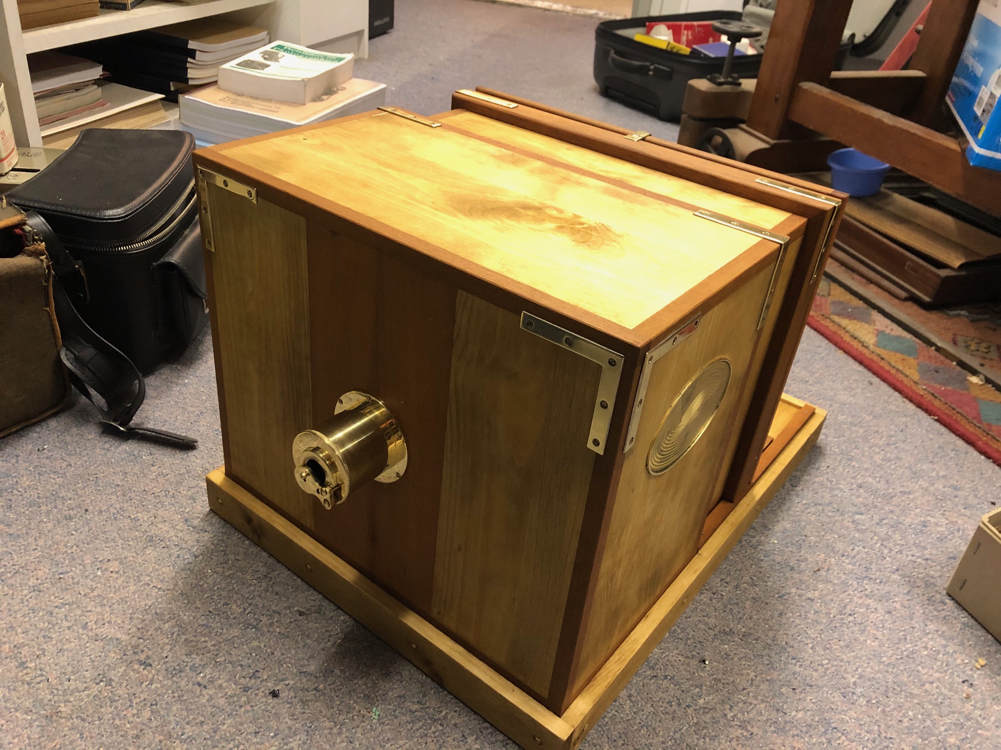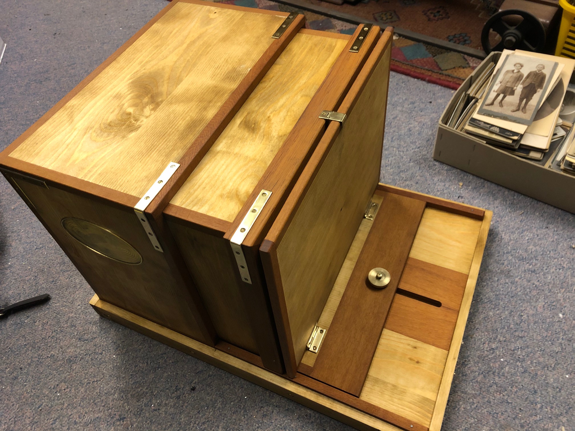 Ich habe mittlerweile herausgefunden, dass die originale Kamera aus Zedernholz gemacht wurde. Beim Objektiv in der Mitte wurde ein Streifen Nussholz eingesetzt. Was mir noch immer unklar ist, sind die genauen Abmessungen und wie genau das Plattenrückteil ausgesehen hat.