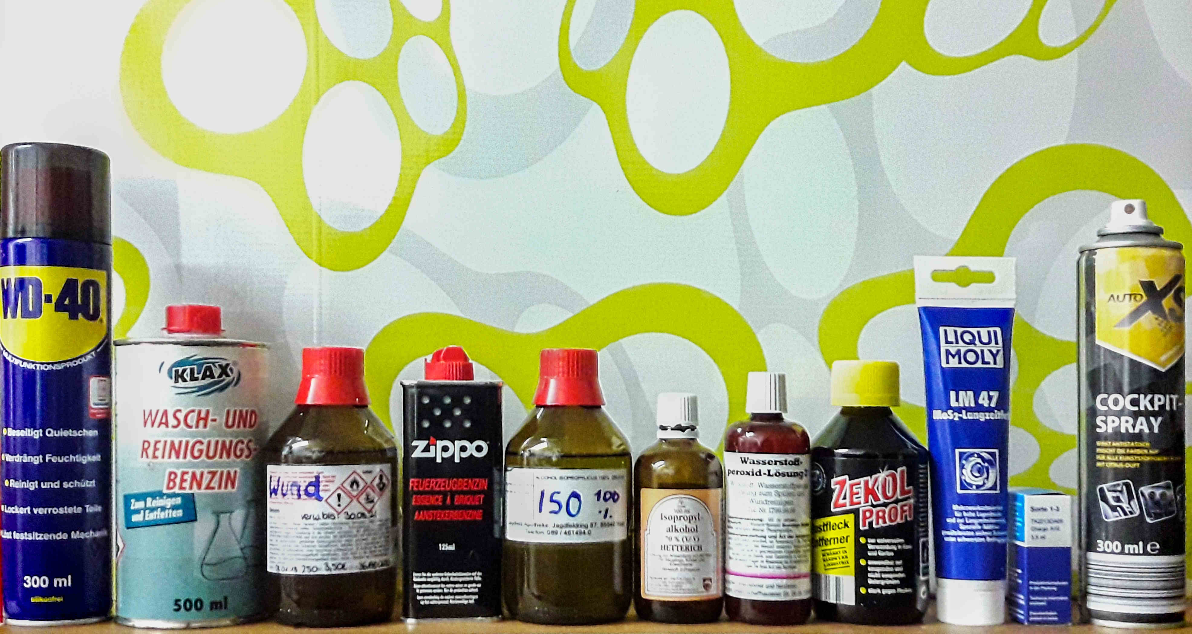als Anfänger im Gebiet der Kamerareparatur hatte ich mir über Monate im Internet angelesen, was alles so zum Reinigen und Schmieren empfohlen und nicht empfohlen wird. Es ist eine "Geheimwissenschaft", so hatte ich den Eindruck. Herrlich fand ich die Verfechter von Bremsenreiniger, Zigarettenasche und Babyöl. Von WD40 wird ja, ganz besonders unter Deutschen, ganz vehement abgeraten. Es kriecht und das ist unheimlich. Natürlich alles Quatsch, wenn man die Mittel RICHTIG anwendet. Hier habe ich mal einige der von mir verwendeten Mittel fotografiert. Wenn keine Fragen kommen, will ich auch nichts weiter dazu sagen. Mal schaun, ob es jemanden überhaupt interessiert. Es gibt sicher größere Probleme in der Welt.