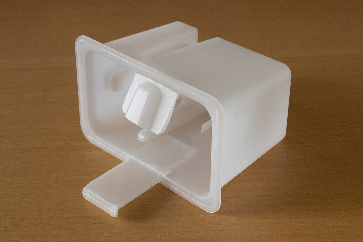 Zwei Laschen halten den Streuvorsatz passgerecht vor dem ausgeklappten Blitz fest. Die obere liegt am Blitzgehäuse an, die untere rastet im Blitzschuh ein. Die Laschen wurden einfach mit Heisskleber befestigt.