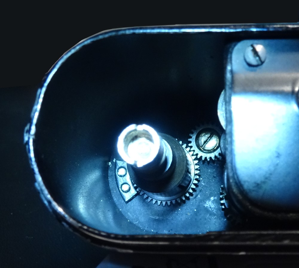 Gucke ich tief in das Loch, wo die Aufnahmespule drin gesessen hat, ist klar, woher der Widerstand kommt. Die Aufnahmespule wird auf den Mitnehmer, einen vielleicht dreizehn Millimeter hohen Hohlzylinder, aufgesteckt, der seinerseits mit dem Filmaufzug verschraubt ist. Diese ca. 13mm hochgezogen und sie kommt frei.