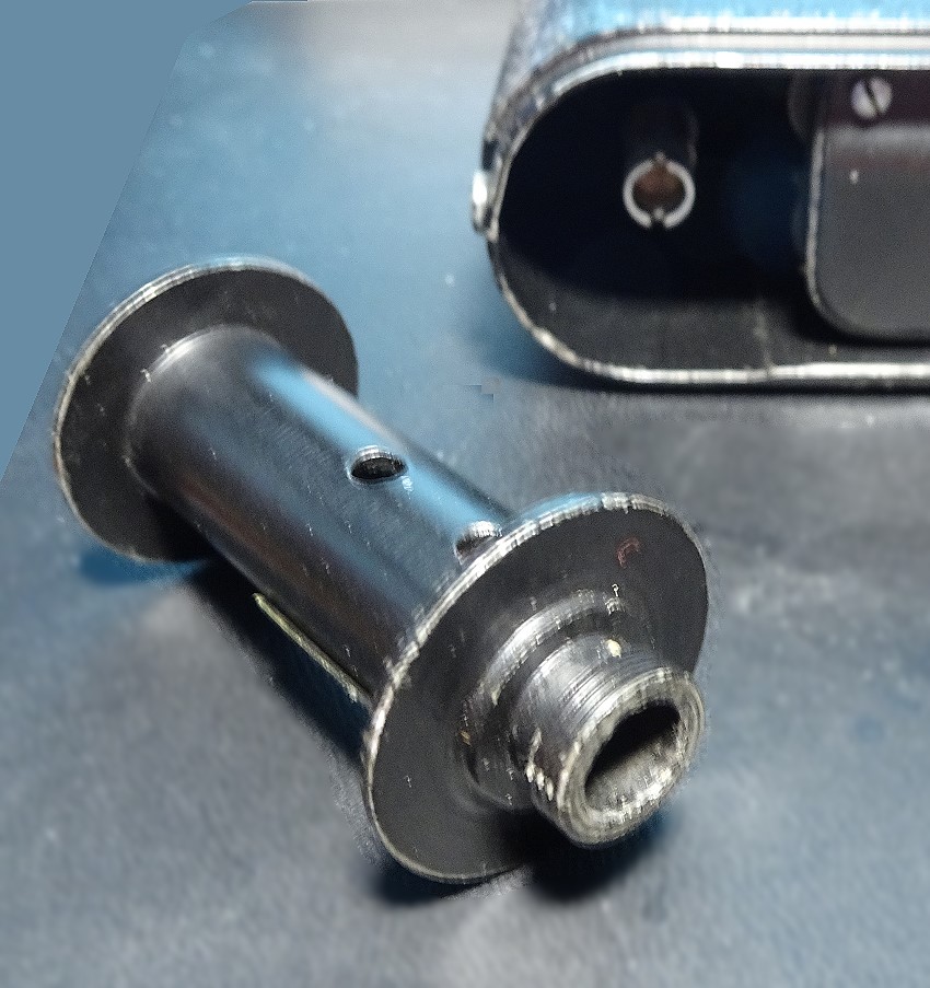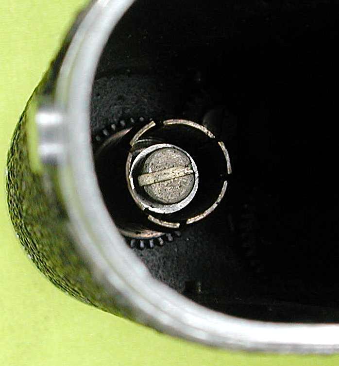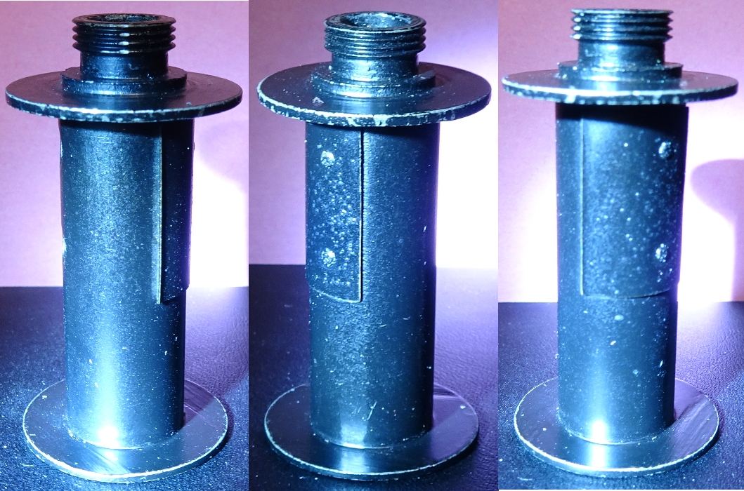 Dieser Hohlzylinder ist durch sechs Einschnitte unterteilt, die nicht ganz genau auf einer Kreislinie liegen. Sprich, man hat sie etwas aufgebogen, damit die Aufnahmespule darauf fest genug gehalten wird, um den Film durch die Kamera zu ziehen. Diese Klemmung verursacht den oben erwähnten Widerstand gegen das Herausziehen der Aufnahmespule.