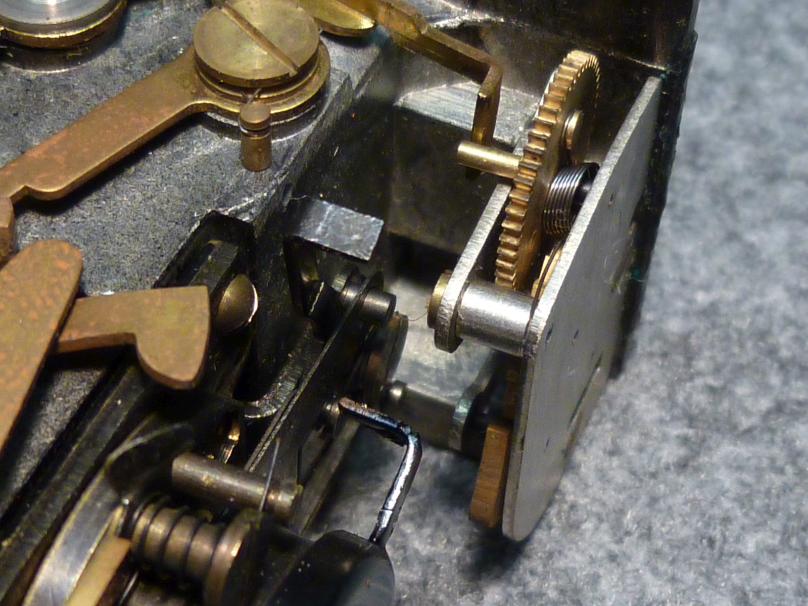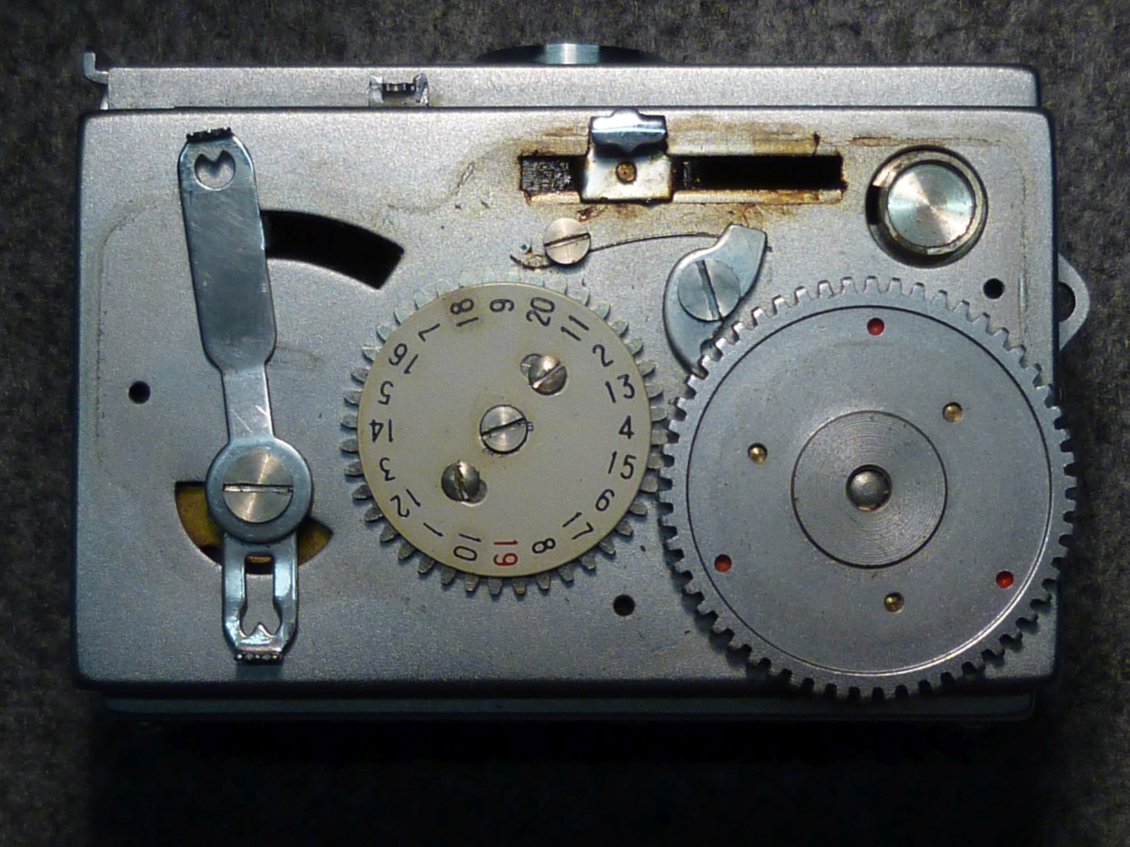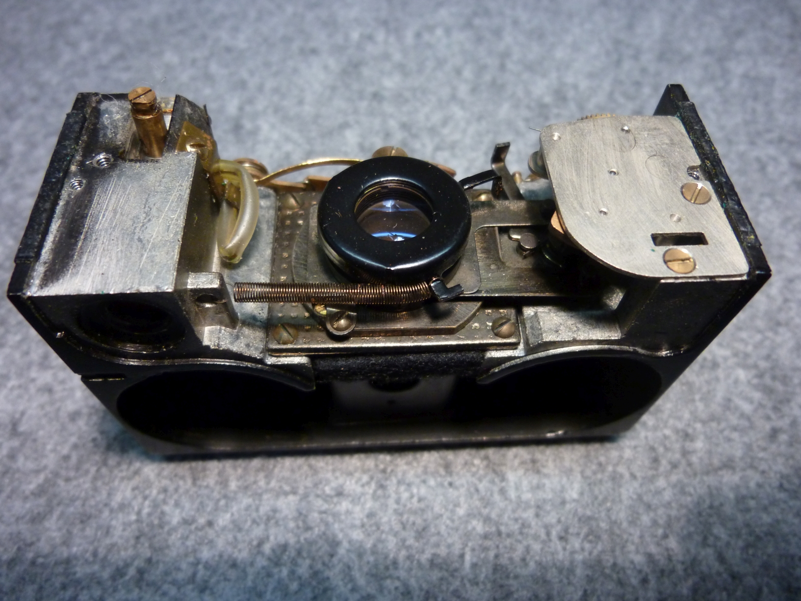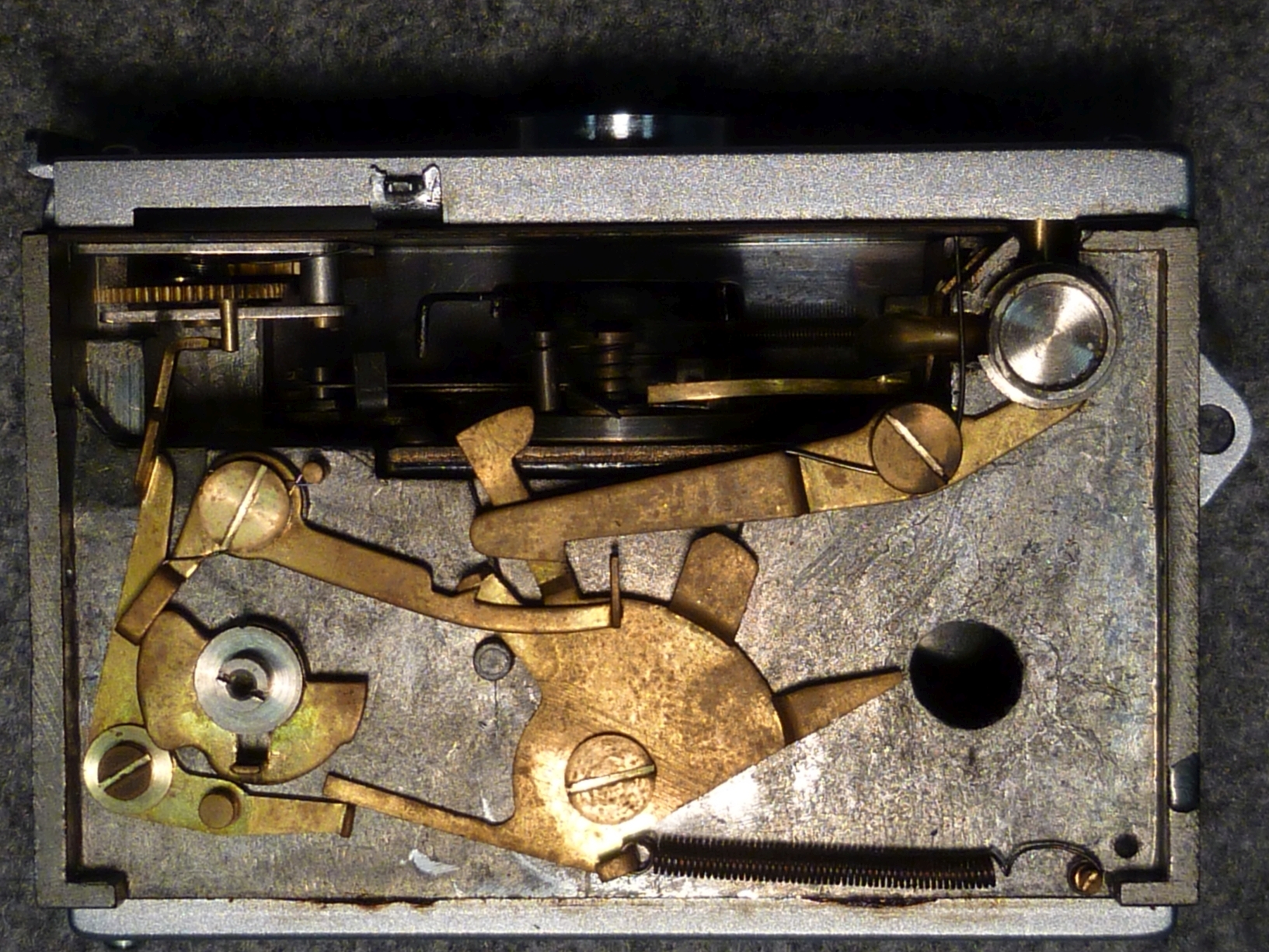 Geölt habe ich nur an den wenigen Stellen, wo Hebel direkt auf dem Gehäuseboden reiben und nur in homöopatischen Mengen. Die von außen bedienbaren Schieber (Entfernungseinstellung, Sucherrahmen/Objektivdeckel, Filterführung, Filterfach) habe ich nur von altem Fett gereinigt ohne erneut zu schmieren. Die Teile sind so gut gearbeitet und laufen daher ungeschmiert sehr weich, dass ich wegen der Nähe zum Objektiv auf den Einsatz von Schmiermitteln verzichtet habe.