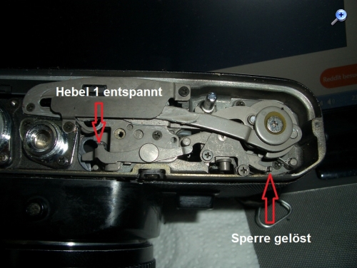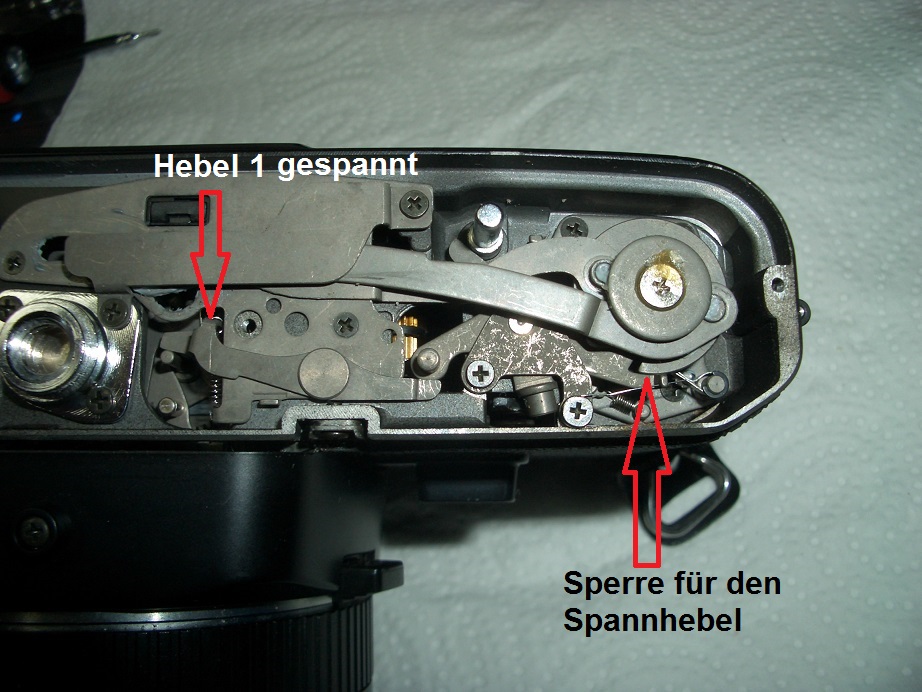 Bei der SD 1 liegt dieser Fehler nicht vor. Wird der Auslöser betätigt entspannt Hebel 1 und die Sperrklinke gibt den Spannhebel frei.
