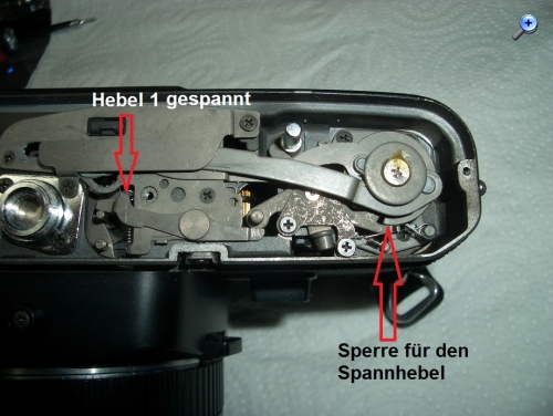 Meine Vermutung: der letzte Auslösevorgang ist, warum auch immer, nicht abgeschlossen worden. Deswegen ist der Verschluß offen und der Spannhebel logischwerweise blockiert.