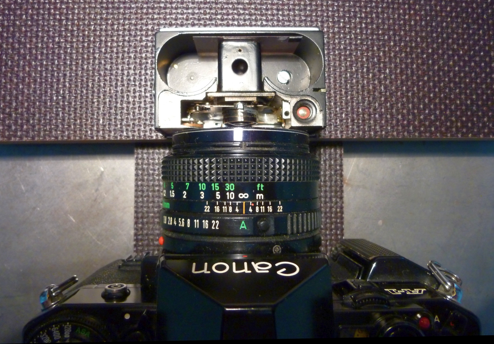 Für den Meßaufbau habe ich meine alte Canon A1 mit 50 mm Normalobjektiv genommen: