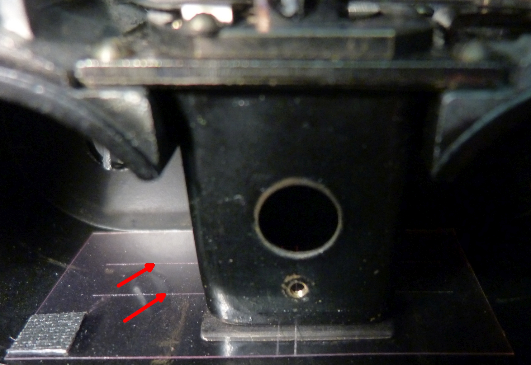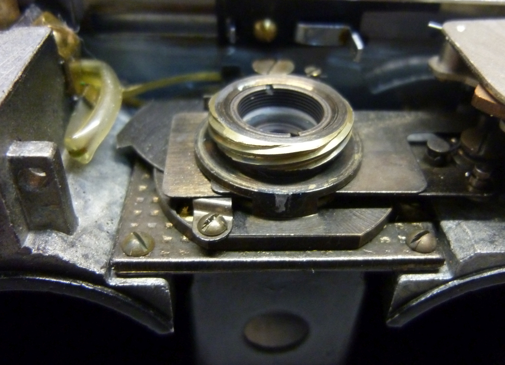 Ich habe deshalb heute die Kamera geöffnet und mir die Fokussierung angesehen. Ich hatte den Eindruck, dass "unendlich" nicht wirklich richtig eingestellt war. Also habe ich mir die Möglichkeit geschaffen, die vordere Linse (nur die wird bewegt) bis zur Auflagebene verstellen zu können. Dort liegt sie jetzt an, wenn ich auf unendlich einstelle. Mehr ist nicht möglich.