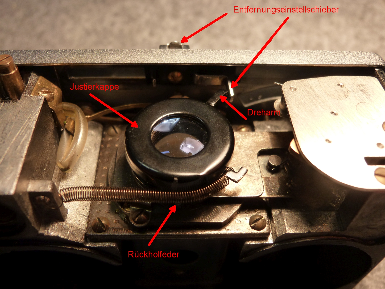 Der Einstellschieber überträgt die lineare Bewegung der Entfernungseinstellung auf den Dreharm der Justierkappe gegen den Zug der Rückholfeder. Diese sorgt für eine spielfreie Verstellung der Objektivspindel.