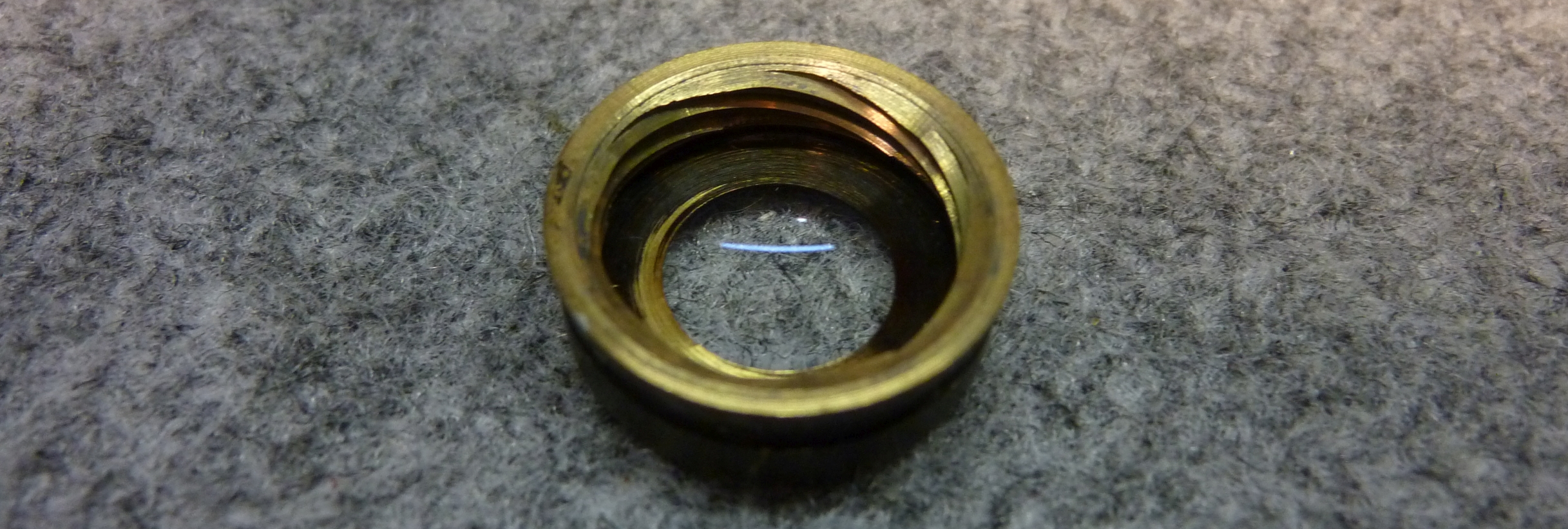 Die Justierkappe kann von der Linsenfassung abgezogen und in einem anderen Drehwinkel wieder aufgesetzt werden. Auf diese Weise lässt sich das Objektiv justieren. Hier die Situation mit abgezogener Justierkappe und abgeschraubter Frontlinse. Dabei ist das Spindelgewinde deutlich zu erkennen: