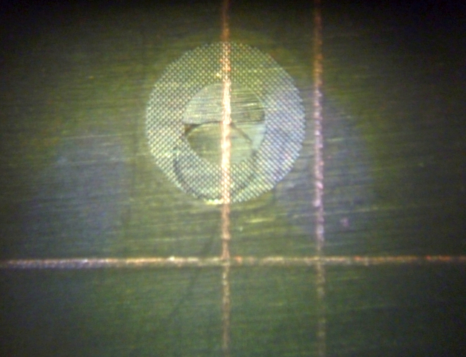 Die Kamera wurde nun mit aufgeschraubter Frontlinse, aber ohne Justierkappe wie im ersten Bild gezeigt an der auf unendlich eingestellten Canon A1 angesetzt. Durch den Sucher der SLR wurde nun die Testkarte betrachtet, die in der Filmebene der Mamiya eingeschoben war. Nun musste die Frontlinse der Mamiya so gedreht werden, dass die Linien auf der Testkarte einwandfrei scharf waren. Dies konnte mit dem Schnittbildindikator erreicht werden. Hier der Blick duch den Sucher der SLR nach der Justage. Auf die linke senkrechte Linie wurde scharf eingestellt: