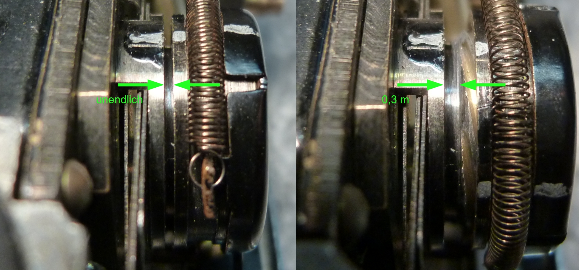 Zwischen den beiden Extremstellungen des Objektivs liegen 0,9 mm. Dabei wird die Frontlinse um 63° verdeht. Hier die beiden Spaltmaße für die Einstellungen "unendlich" und für die kürzeste Entfernung "0,3 m":