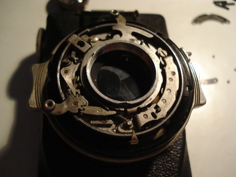 Die komplizierte Demontage wo ich mich getraut habe war ein Gauthier IBSO von 1914 in einer Ihagee Patent Duplex von 1924. Da ist der Drahtauslöser stecken geblieben, und der Verschluss lief nicht mehr. Dabei sind viele Kleinteile zu demontieren und das grosste Risiko liegt daran, dass beim späteren Zusammenbau die Veschlusszeiten nicht mehr passen können (sowieso nach der Zeit diese Zeiten sind nicht mehr zuverlässig bei diesem Verschluss). Die Operation hat sich aber wieder gelohnt und hier habe ich auch viel gelernt. Der Verschluss am Ende lief wieder einwandfrei (die genaue Zeiten habe ich aber davor und danach nicht gemessen). Am Anfang habe ich mich nicht getraut, da die Kamera ist in einem sehr guten Zustand, aber dann habe ich es wieder gedacht: „Wenn ich nichts mache, der Verschluss wird nicht funktionieren, und wenn ich etwas mache kann sein dass der Verschluss hinterher auch nicht funktioniert“ Also ich hatte zumindest eine Chance beim Öffnen des Veschlüsses. Und die Kamera hat etwa 20€ gekostet und ist bestimmt wieder zu finden also…Attacke!!