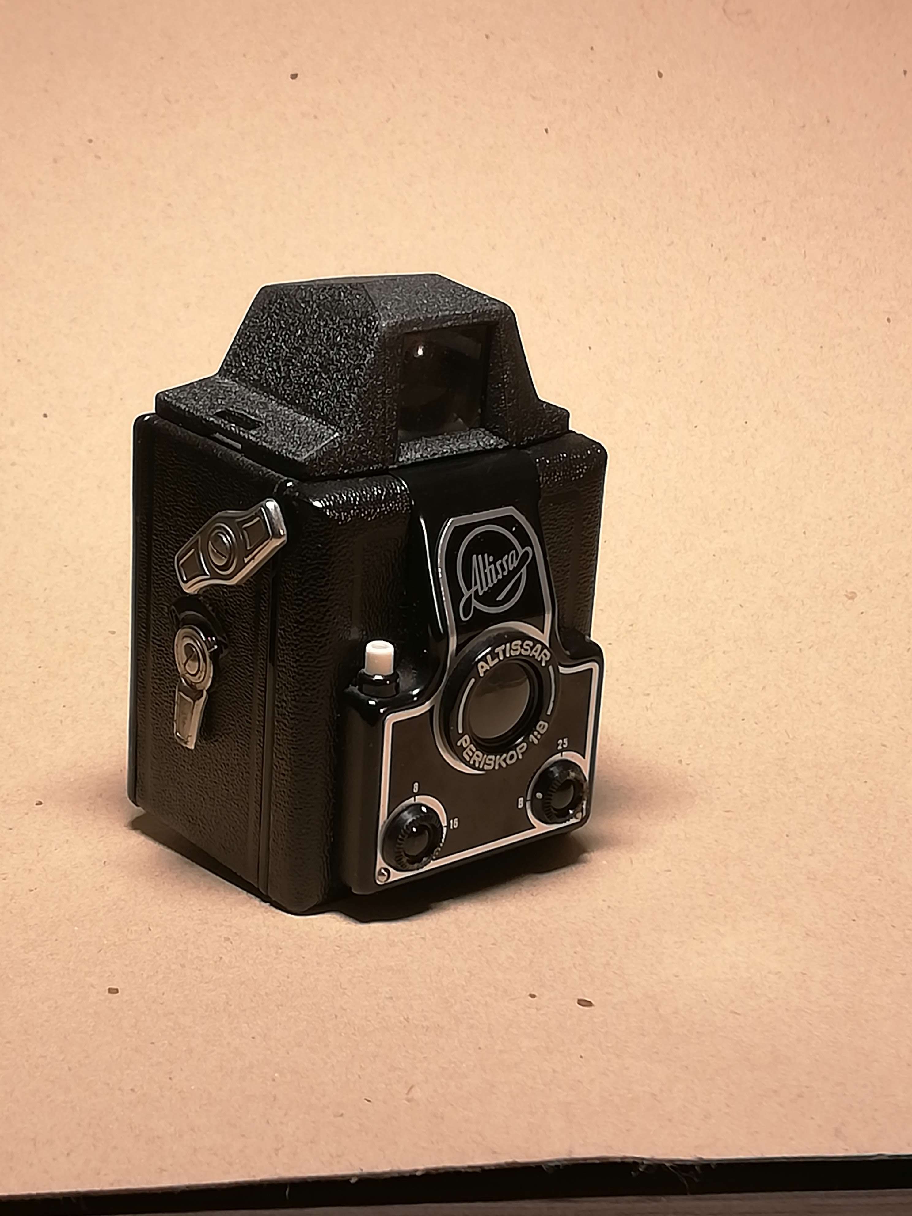 Bevor sich alle hier verrennen ... ich fände es besser, Du schaffst Dir eine ca. 100x so leistungsfähige Kamera an, ich denke da an ein Photohandy Sony-Ericsson k750i, als eine ehrwürdige und wirklich tolle Box Altissa 6x6 zu ruinieren. Falls Du, wie ich, süchtig danach bist, antike Boxkameras wirklich zu benutzen, würde ich mit einer Ensign-All-Distance oder Tengor anfangen. Nur, um ein paar hochgeschätzter Forumsteilnehmer unter uns was zu bremsen, die gerade Beihilfe leisten, eine schicke alte Box durch abgebrochene Laschen einer Okularbefestigung, sich zentimeterweit durch ein Kameragehäuse fressende Spiralbohrer beim Ausbohren von Nieten (ist mir in 70 Jahren noch nicht unter Ruinieren der Optik in 30fachem Nietendurchmesser gelungen) etc. zu ruinieren ;) .