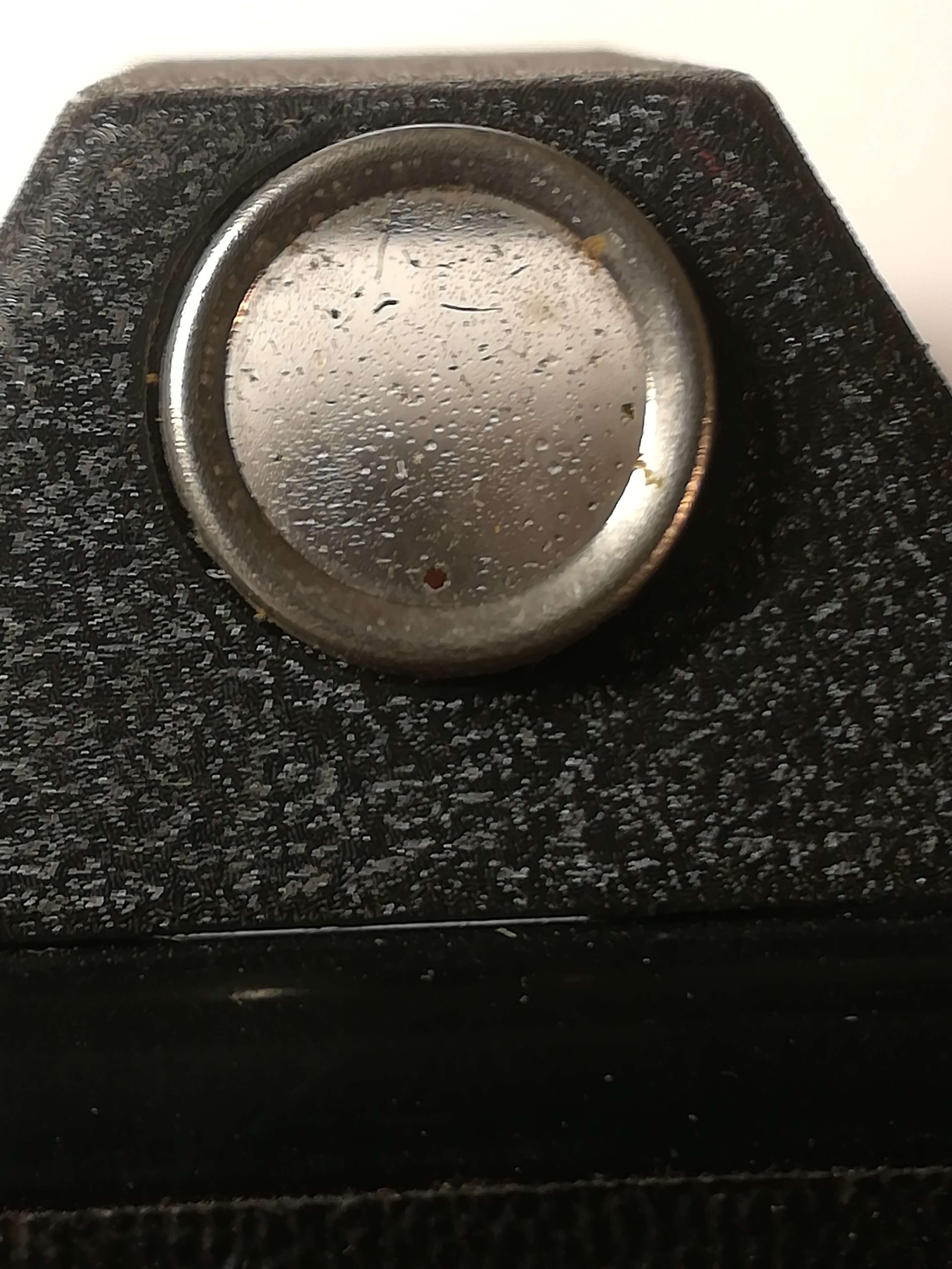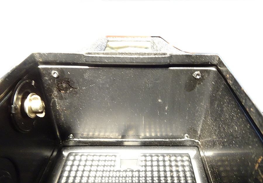 Sollte dder Schmutz aber an den Innenseiten der Sucher-Gläser anhaften, wird die Reinigung schwieriger, denn man kommt nicht ohne Eingriff an das Innere des Sucherkastens. Den bekommt man nur ab, wenn die 4 Nietungen (innen oben im Kameragehäuse) aufgebohrt werden. An die beiden hinteren Nieten kommt man aber relativ schlecht heran. Und: man muss sich überlegen, wie später der Sucher-Kasten neu befestigt wird.