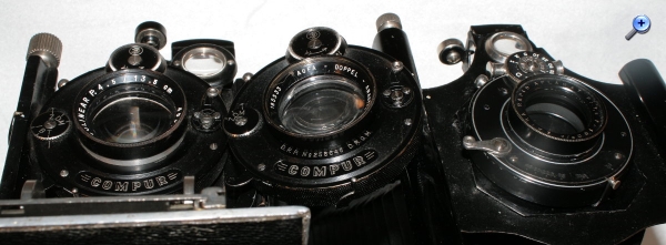 Der Compur 1 ca. von 1927 - also eher ein später Rädchencompur! - hat vorne und hinten etwas wie M31,2x0,5x (wenn's denn ein metrisches Gewinde sein sollte. Könnten x0,02", also x0,508mm, sein ...). Vorder- und Rückglied sind trotzdem nicht tauschbar (u.a. Dicke der Glieder!). Und das Anschraubgewinde ist ca. M34x0,6. Habe in meiner Liste gewühlt. Und probiert. Der Tausch funktioniert mit keinem meiner Compure. Die Glieder lassen sich aber mehr oder weniger einschrauben in Verschlüsse passender Größe der Arten Derval, Cronos, IBSO und Bausch&Lomb Double Valve Automatic. Wegen der unterschiedlichen Dicken. Full fit gibt's aber bei einem IBSO, in dem normalerweise ein Rapid Aplanat 1:7,5/190mm sitzt (rechts im Bild). Vorder- und Hinterglied sowie Anschraubgewinde. Naja - die Filtergewinde sind natürlich sehr weit auseinander ...