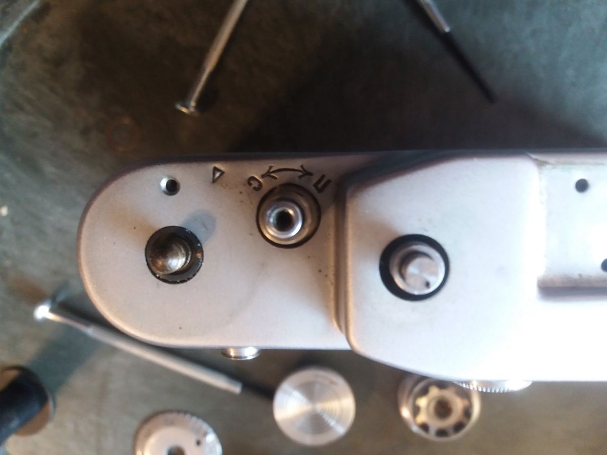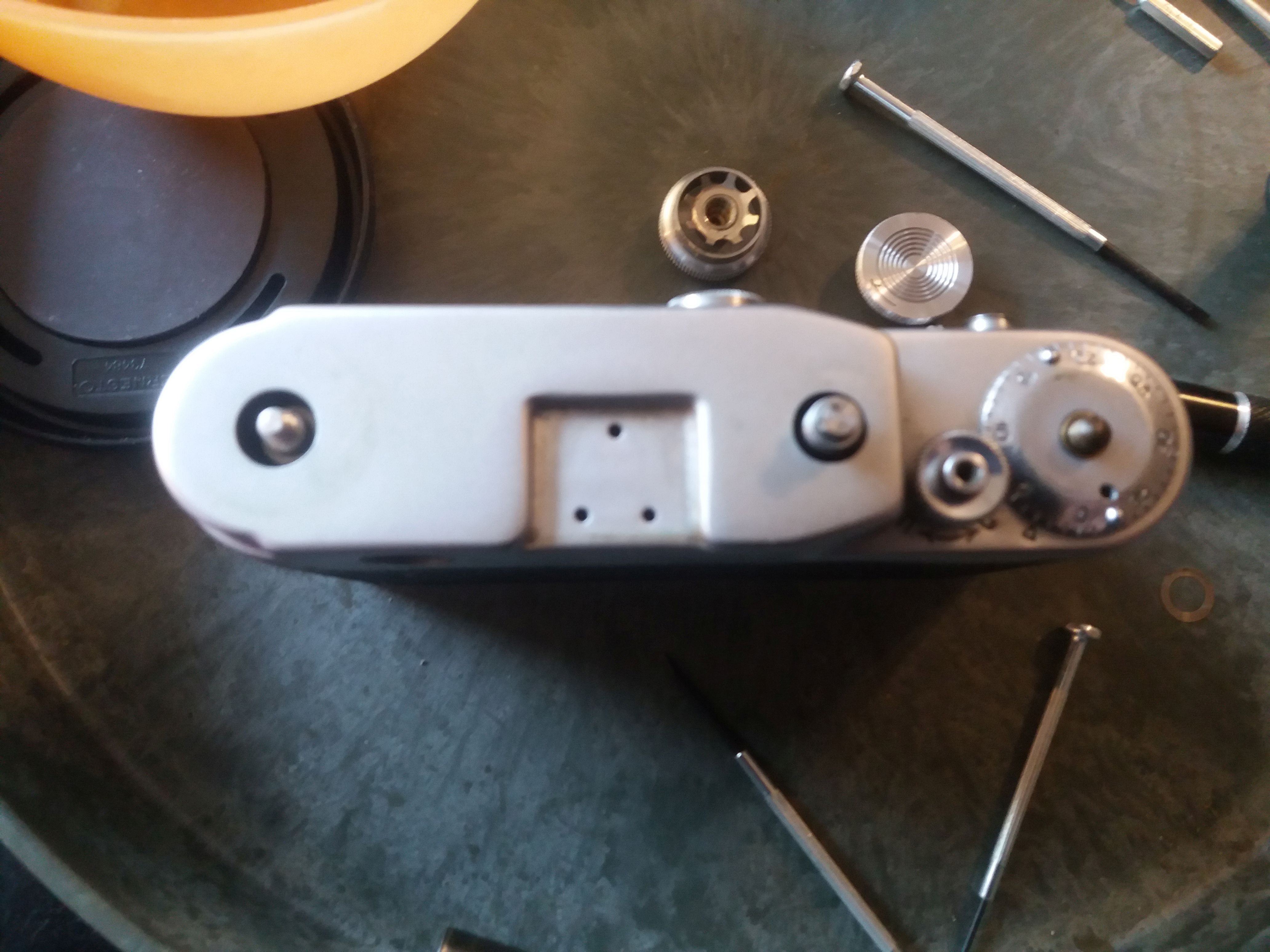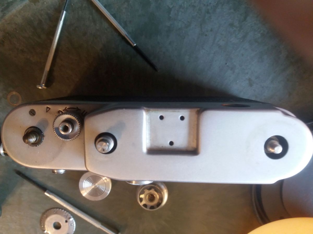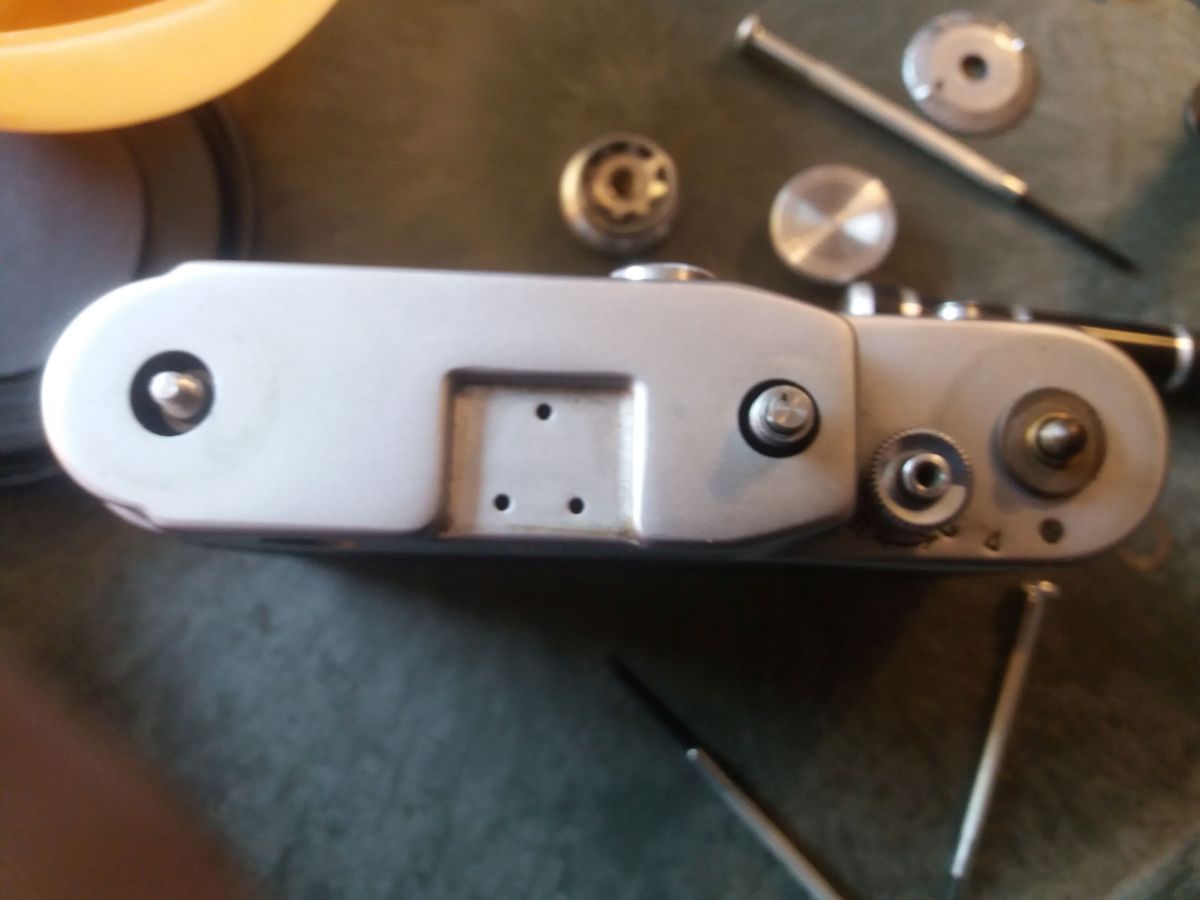 Gutes Licht. Sehr feine Schlitz Schraubendreher. Einen Spannschlüssel oder ähnliches. Behältnisse für Einzelteile und Schrauben, am besten mehrere kleine. Eine sehr ruhige Hand. Geduld in Mengen. Ein Fotohandy. Macht von jedem Schritt ein Foto, so das ihr später nachschauen könnt wie ihr was gemacht habt, und wie was zusammen gehört. Spannt den Verschluss und stellt die Zeit auf B. Zuerst könnte ihr die offensichtlichen Schrauben an Front und Rücken entfernen, die kürzeste ist die neben den Objetivbajonett. Die Schrauben im Blitzschuh lasst ihr wo sie sind. Danach werden die schrauben in den Knöpfen, mit einem sehr feinen Schlitzschraubenzieher entfernt, ihr solltet auf jeden Fall darauf achten, diese zu trennen, ich hatte den Eindruck das nicht jede davon überall passt. Danach entfernt ihr die Schrauben vom Sucher ( Rückseite ) und nehmt den Ring ab. Der Sucher lässt sich VORSICHTIG ins Gehäuse schieben. Jetzt schraubt ihr an der Vorderseite den Ring vom Messsucher vorsichtig ab. Danach braucht ihr den Spannschlüssel um die darunter liegende Linse herauszuschrauben.