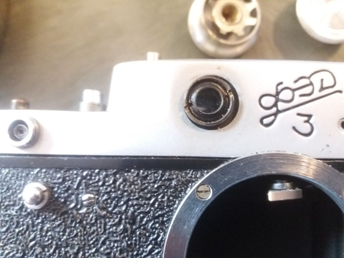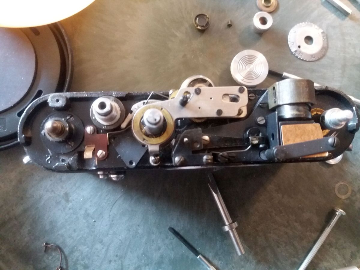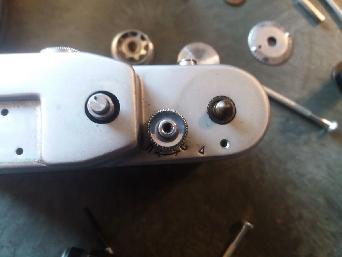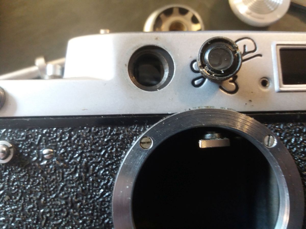 Gutes Licht. Sehr feine Schlitz Schraubendreher. Einen Spannschlüssel oder ähnliches. Behältnisse für Einzelteile und Schrauben, am besten mehrere kleine. Eine sehr ruhige Hand. Geduld in Mengen. Ein Fotohandy. Macht von jedem Schritt ein Foto, so das ihr später nachschauen könnt wie ihr was gemacht habt, und wie was zusammen gehört. Spannt den Verschluss und stellt die Zeit auf B. Zuerst könnte ihr die offensichtlichen Schrauben an Front und Rücken entfernen, die kürzeste ist die neben den Objetivbajonett. Die Schrauben im Blitzschuh lasst ihr wo sie sind. Danach werden die schrauben in den Knöpfen, mit einem sehr feinen Schlitzschraubenzieher entfernt, ihr solltet auf jeden Fall darauf achten, diese zu trennen, ich hatte den Eindruck das nicht jede davon überall passt. Danach entfernt ihr die Schrauben vom Sucher ( Rückseite ) und nehmt den Ring ab. Der Sucher lässt sich VORSICHTIG ins Gehäuse schieben. Jetzt schraubt ihr an der Vorderseite den Ring vom Messsucher vorsichtig ab. Danach braucht ihr den Spannschlüssel um die darunter liegende Linse herauszuschrauben.