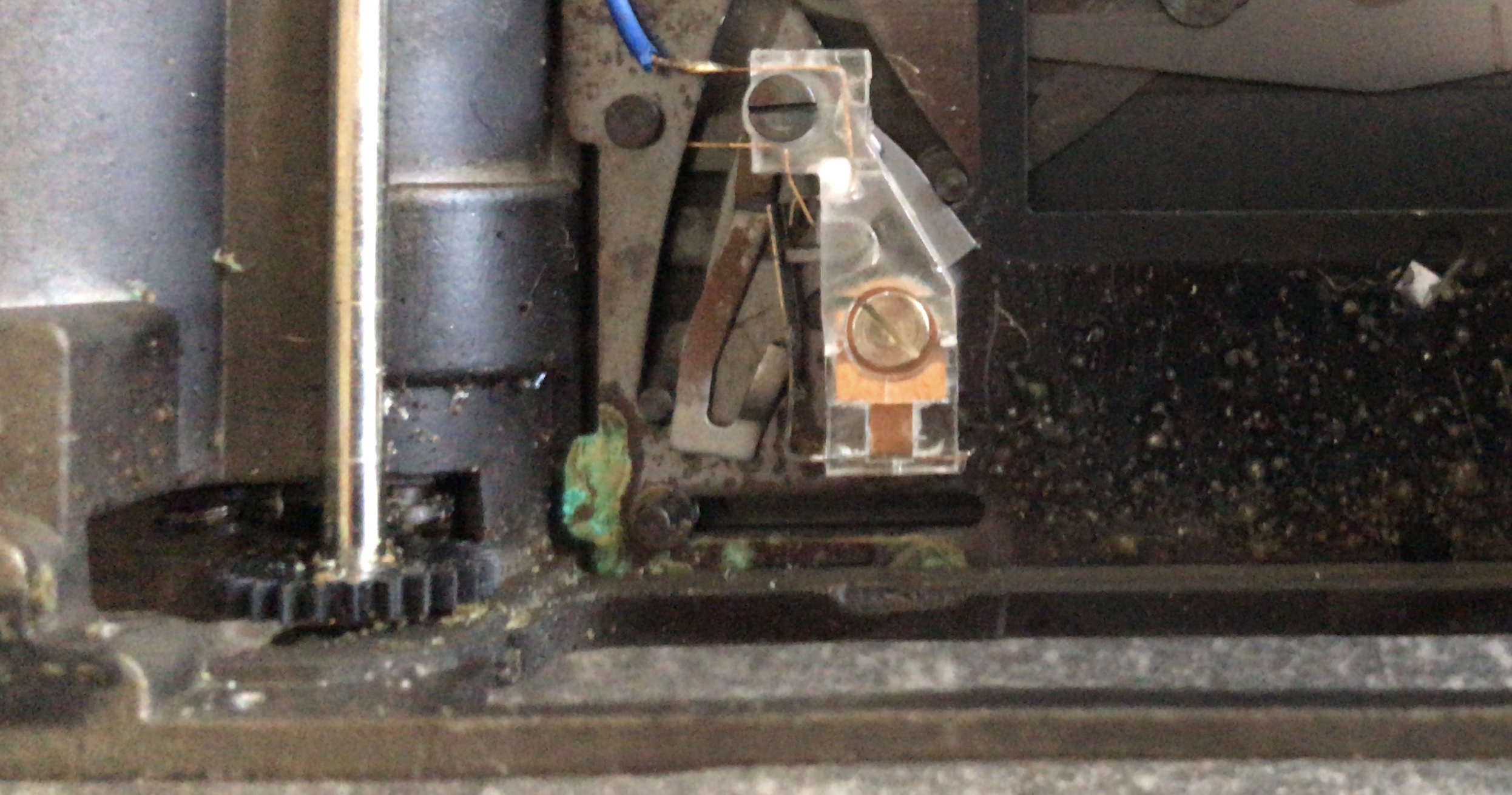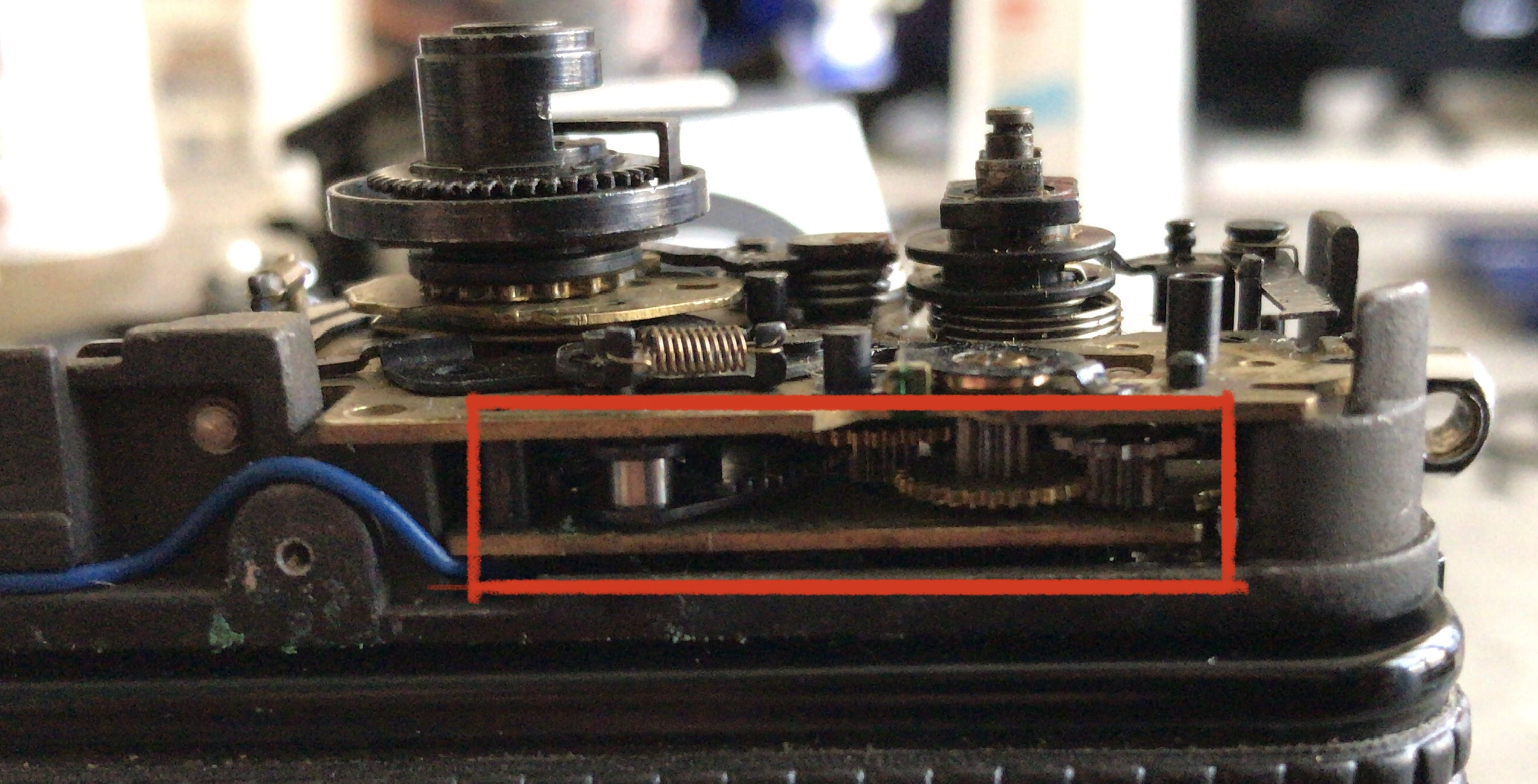 Ich befürchtete schon dass die Verschlusslamellen verklebt waren. Als ich den Verschlussriegel des zweiten Vorhanges bei Seite schob lief der Verschluss jedoch ab. Also weiter geht die Fehlersuche. Es hat mich stutzig gemacht dass sogar in der Deckkappe Reste der Batterie zu finden waren also mal nach der Zeitenbildung gesehen. Da lag dann auch der Fehler, das Langzeitenwerk hing und war komplett mit Batterieresten durchsetzt.
