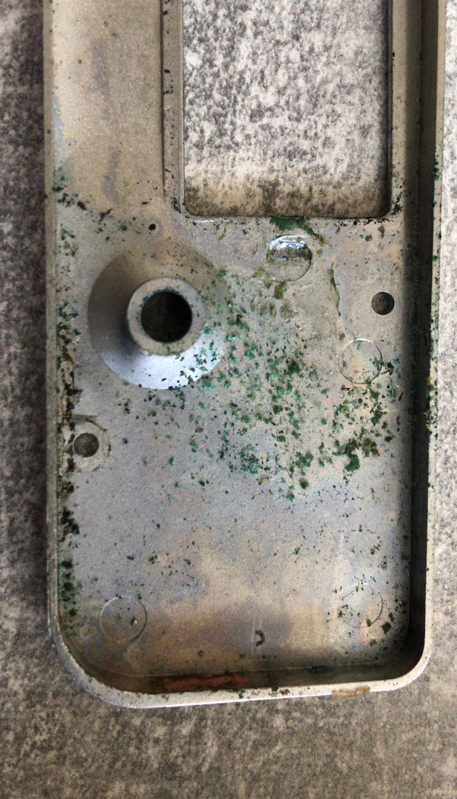 Bei der Demontage kamen mir immer mehr Rückstände der Batterie entgegen, dann der erste Schock: die Verschlusseinheit hatte einen großen Fleck auf der vorderen Grundplatte.