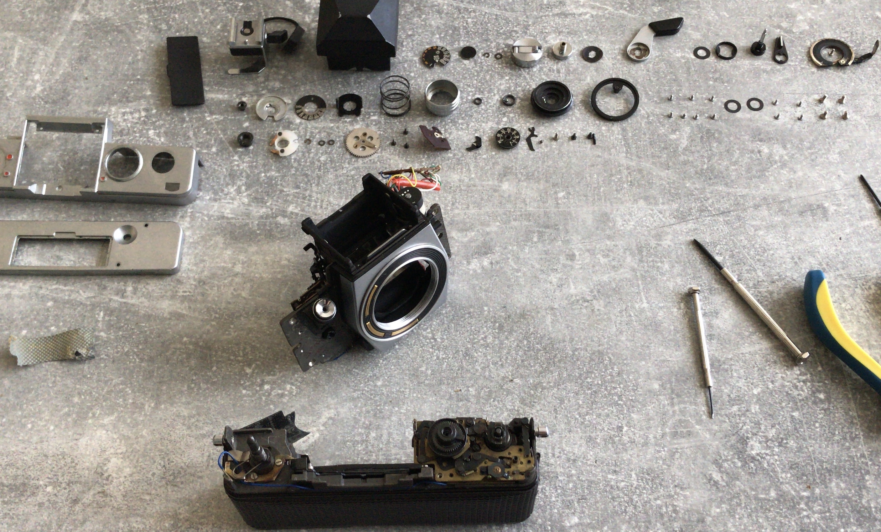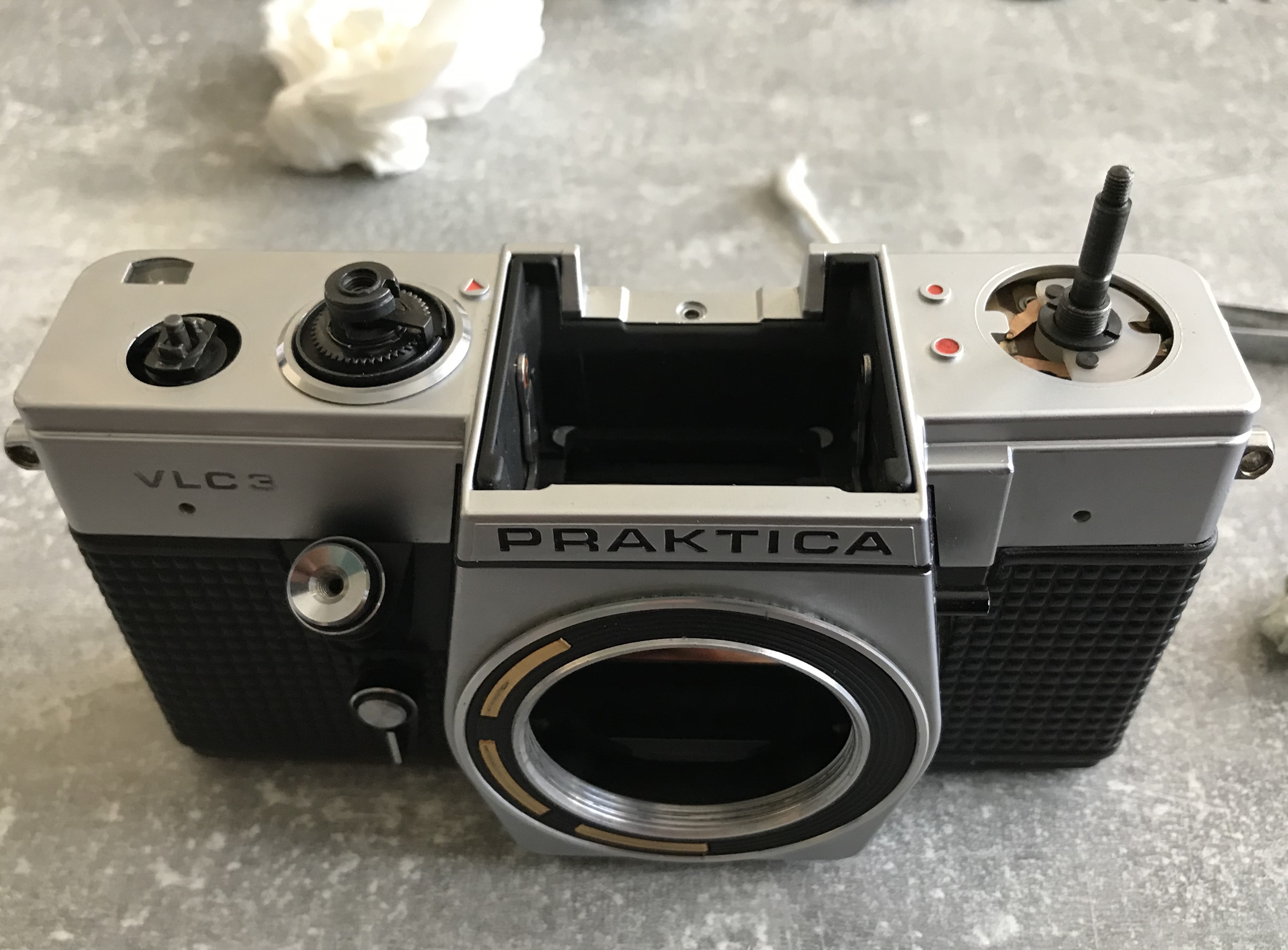 Meine Praktica VLC 3 die ich in einem anderen Beitrag vorgestellt habe war schon länger defekt ich hatte aber nie die Zeit mich ihr anzunehmen. Im Rahmen der Vorstellung habe ich mich jetzt einmal überwunden. Problemstellung war: Spiegel oben, Verschluss offen, Aufzug blockiert.