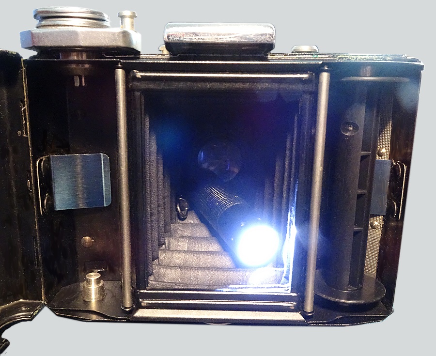 Bei einigen Kameras mit Balgen kann es schwierig sein, sozusagen "um die Ecke zu schauen", deshalb lege ich dann ein Stücke weisses Papier zwischen Balgen und Kamera-Klappe.