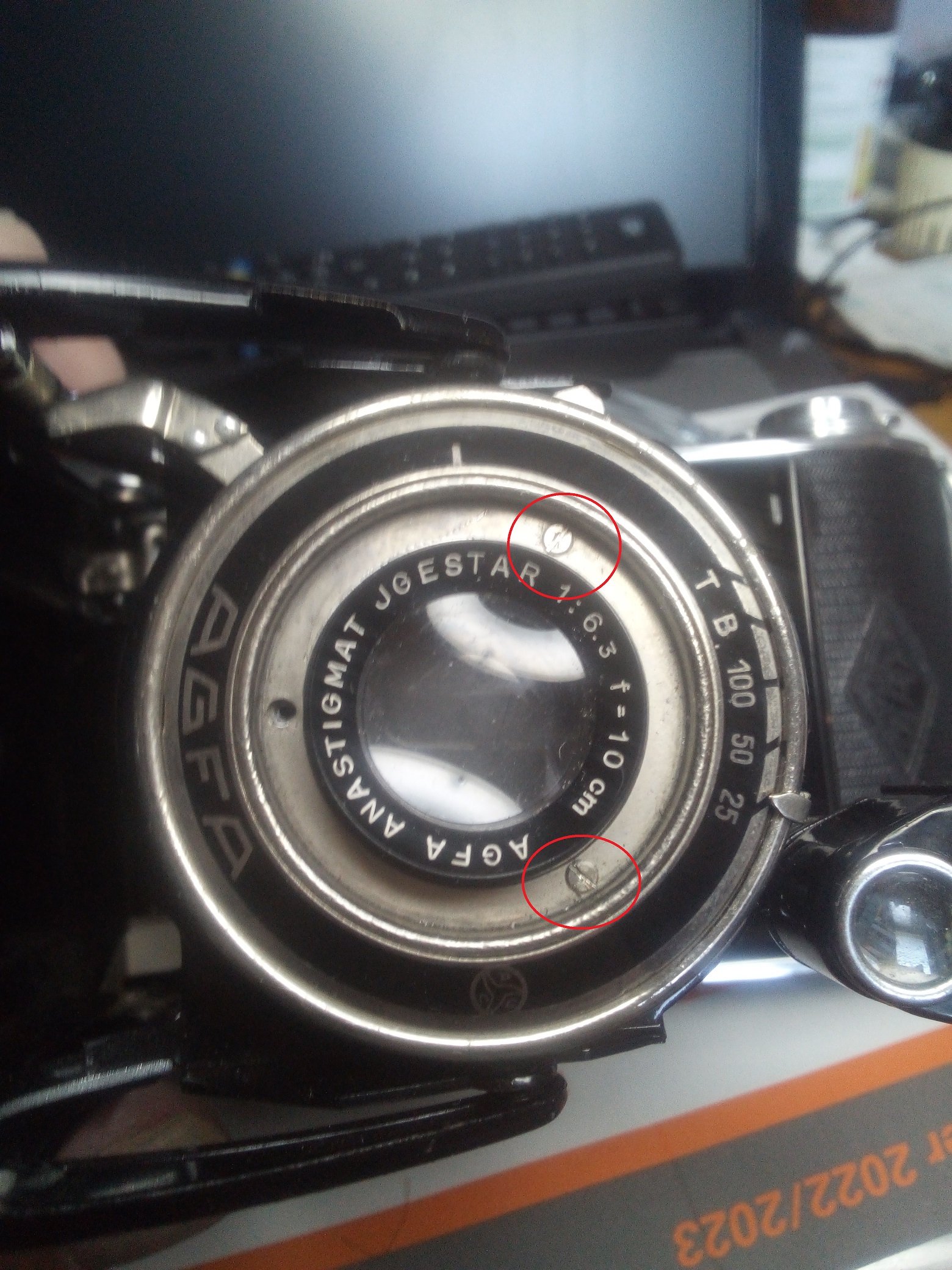 leider ist bei meiner Neuerwerbung die Verstellung für die Fokussierung "Bombenfest". Die Entfernung ist wie auf den Bildern zu sehen auf 5 Meter eingestellt und lässt sich nicht verstellen. Leider habe ich im Netz weder bei GOOGLE noch bei Youtube Leitfäden oder Videos gefunden die mir hilfreich sein könnten ( außer einem allgemeinen Hinweis, dass Verharzung bei alten Agfa Kameras nichts Ungewöhnliches darstellt). Bis jetzt habe ich die 3 Madenschrauben aus dem Verstellring entfernt und diesen abgenommen. Dann eine weitere Schraube unterhalb des Ringes. Die Schrauben ließen sich sehr leicht lösen. Nun finde ich (siehe Markierungen in Bild 2) noch zwei Schrauben? vor, die sehr fest zu sitzen scheinen. Frage an die Wissenden: Sind das überhaupt Schrauben, die gelöst werden müssen? Gibt es irgendwo, im Netz oder hier im Forum, eine Anleitung zu diesem Objektiv und / oder zu meiner Problematik? Ohne Anleitung / Unterstützung werde ich meine Versuche an dieser Stelle abbrechen und die Record wird ihr Dasein als Vitrinenstück fristen.