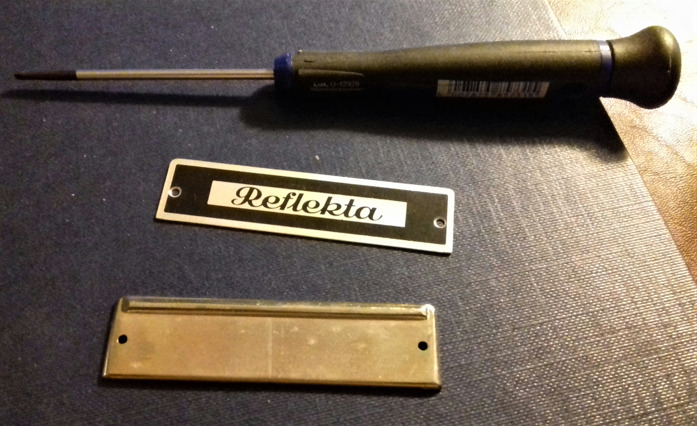 inzwischen konnte ich die "Reflekta" reparieren, ein neuer Spiegel (von MediaLas, ebay) ist drin, der Sucher ist wieder hell und klar, und sogar das Namensschild hat sich überraschenderweise wiedergefunden (war falsch herum angeschraubt!). So sieht sie jetzt aus: