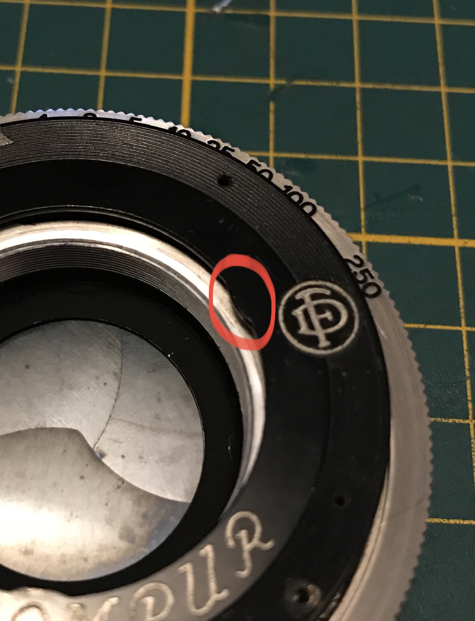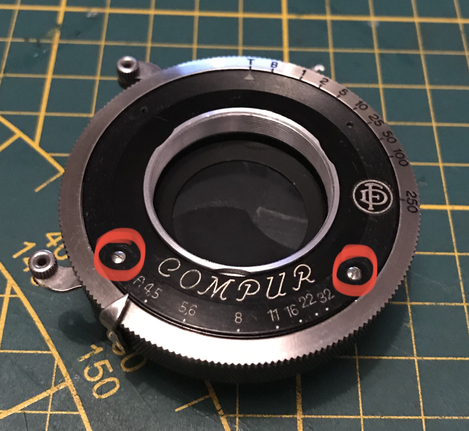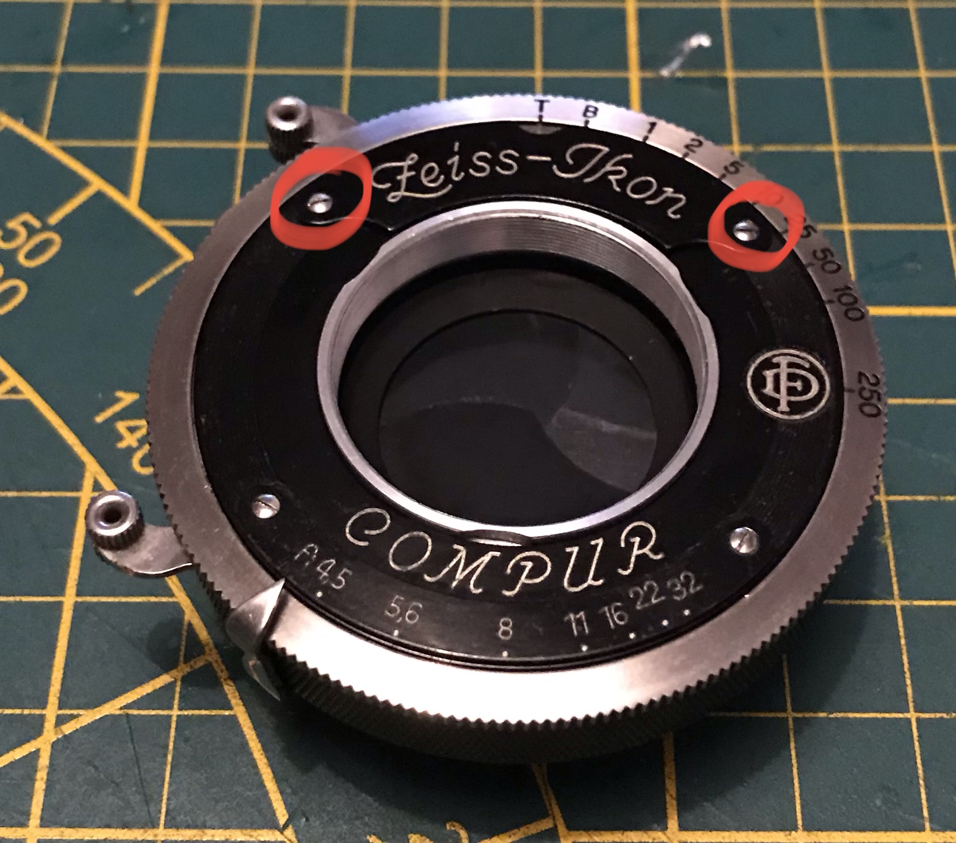 Da es sich um eine Zeiss Ikon handelt hängt natürlich auch ein Schild mit dem Firmennamen am Verschluss. Da ich den Verschluss auch gerne komplett reinigen möchte werde ich dieses Schild ebenfalls entfernen, was zur Demontage nicht unbedingt nötig wäre, andere Hersteller haben auf ein solches Schild verzichtet. Dazu die beiden eingekreisten Schrauben lösen und das Schild abheben. Wichtig ist grundsätzlich beim Schrauben lösen dass man immer eine passende, saubere und gerade Schraubendreherklinge verwendet um so das Ausreißen des Schlitzes und/oder das Abrutschen und Verkratzen des Objektives zu vermeiden.