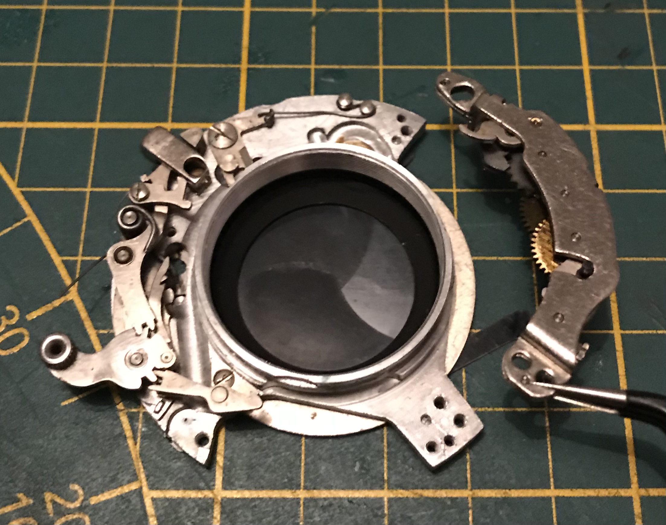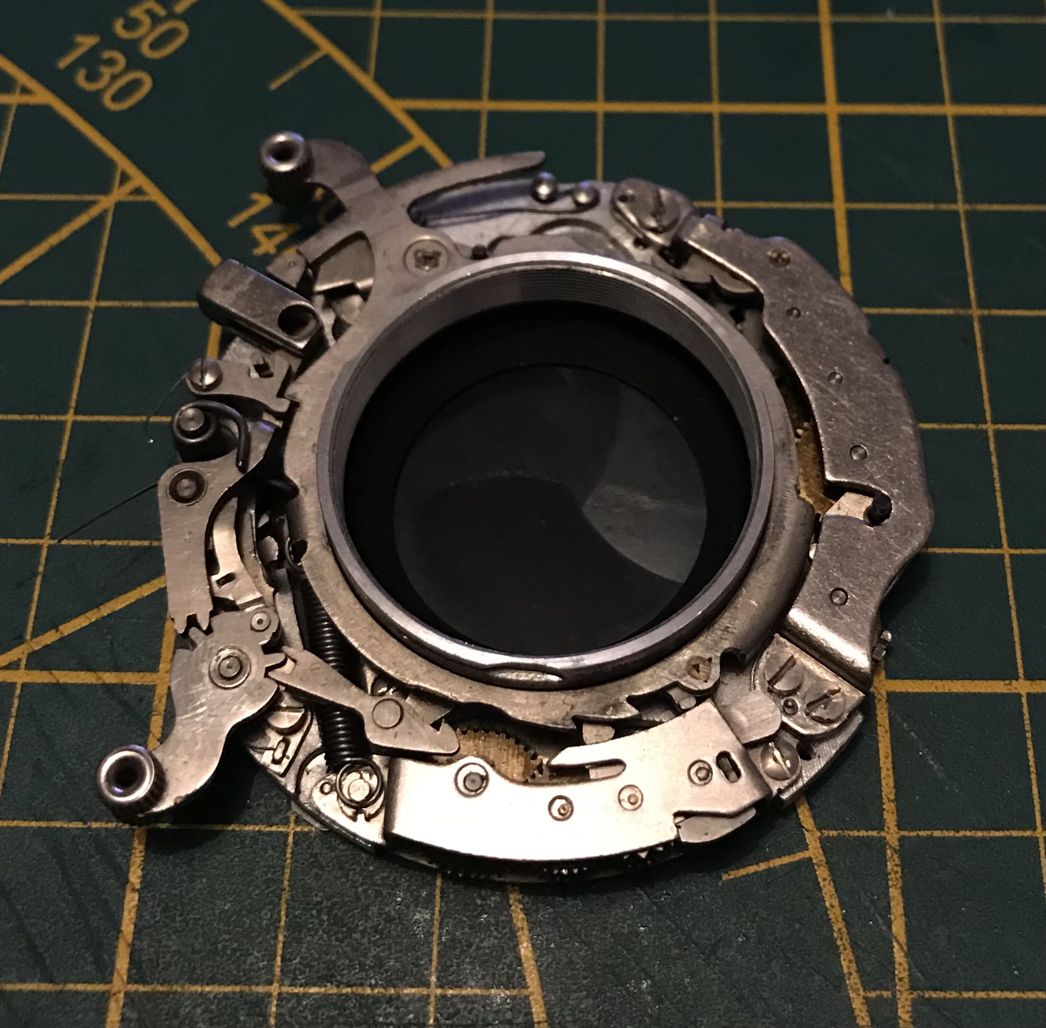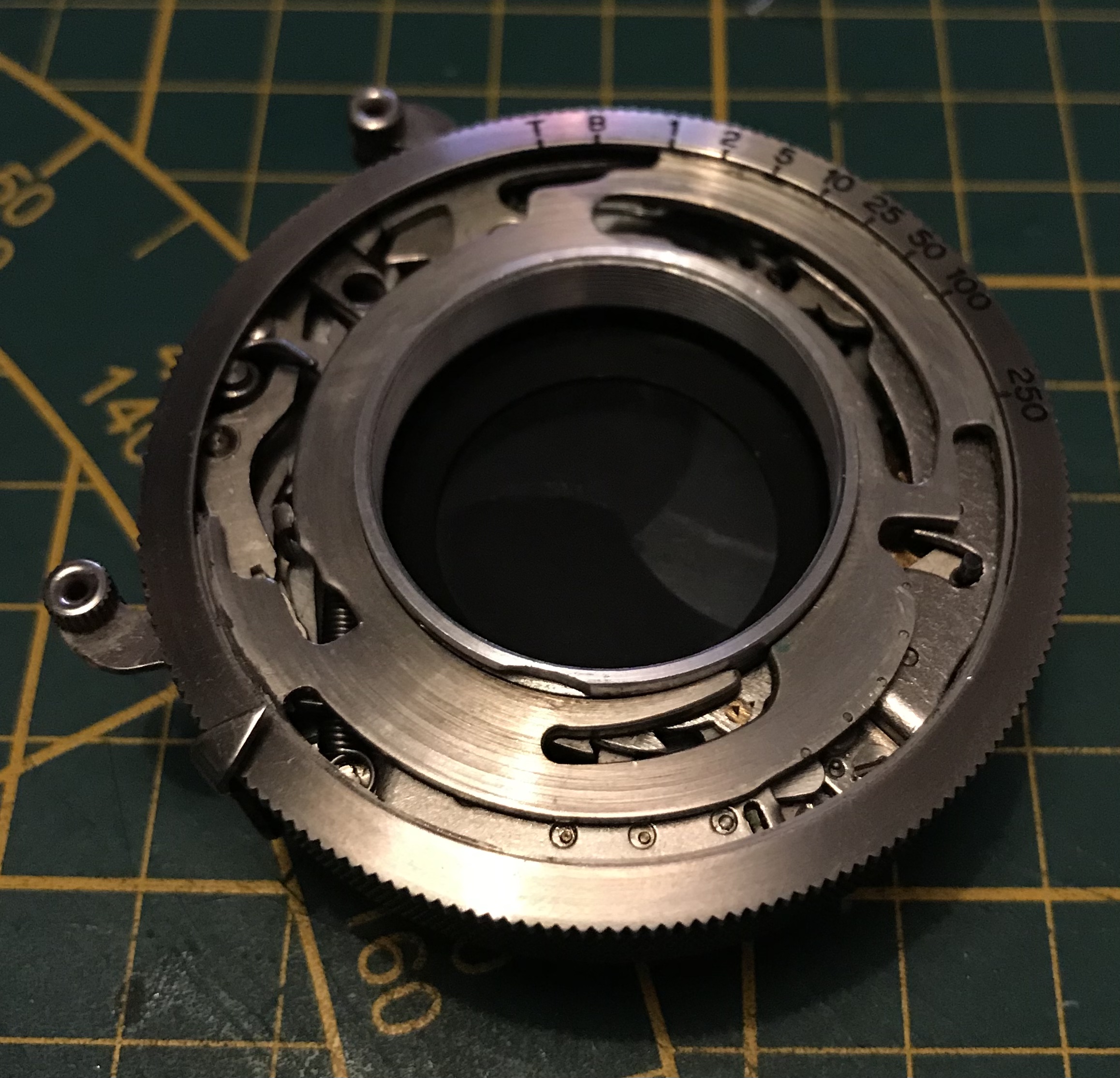 Weiter gehts. Wir haben den Verschluss nun soweit erforderlich zerlegt, sollten nun noch die Verschlusslamellen verölt sein lassen sich diese mittels der Schrauben auf der Rückseite abschrauben, reinigen und wieder montieren. (bei der Montage darauf achten dass die Nasen an den Verschlusslamellen wieder in die Öffnungen der Auslöserscheibe eingreifen.)