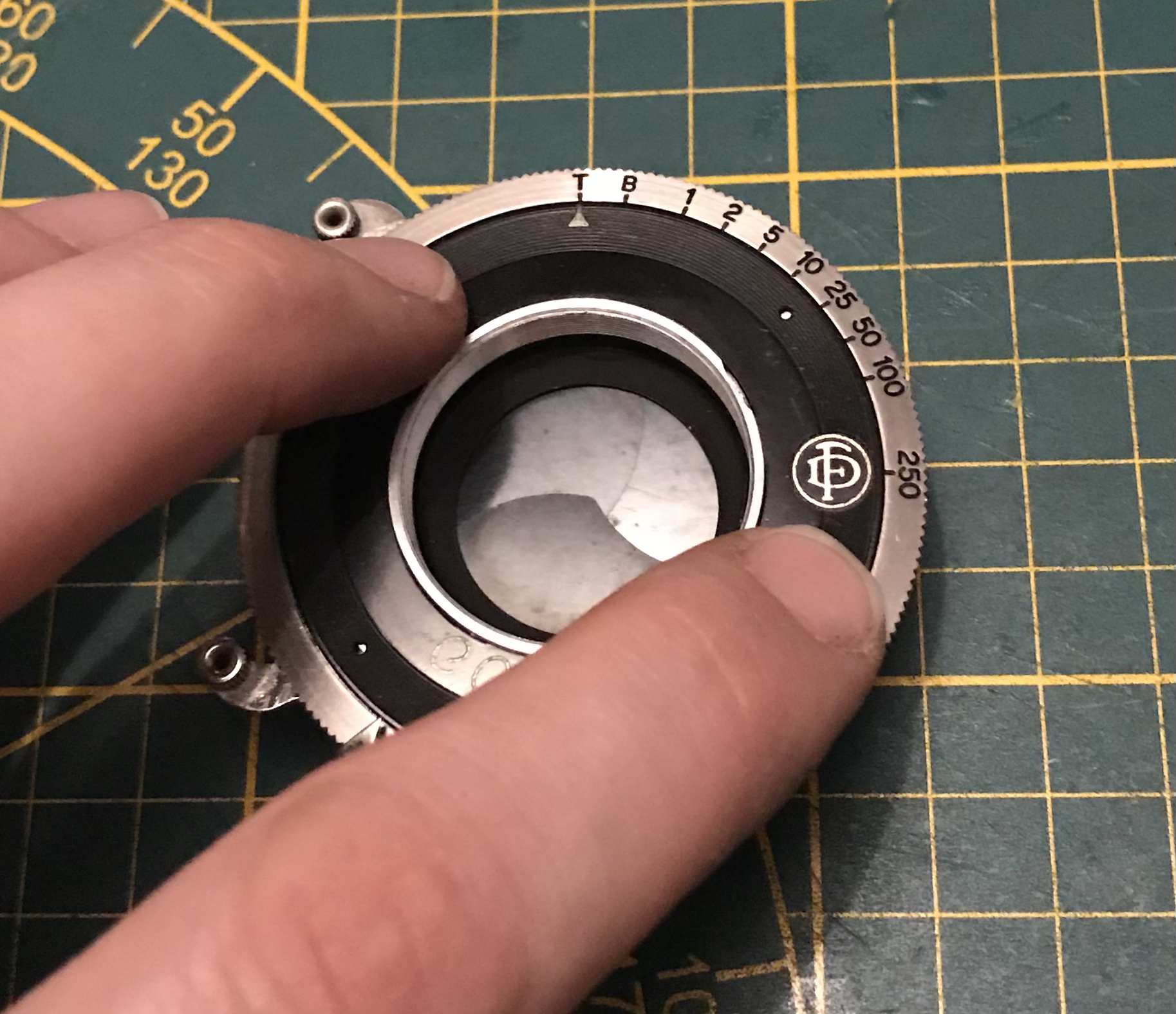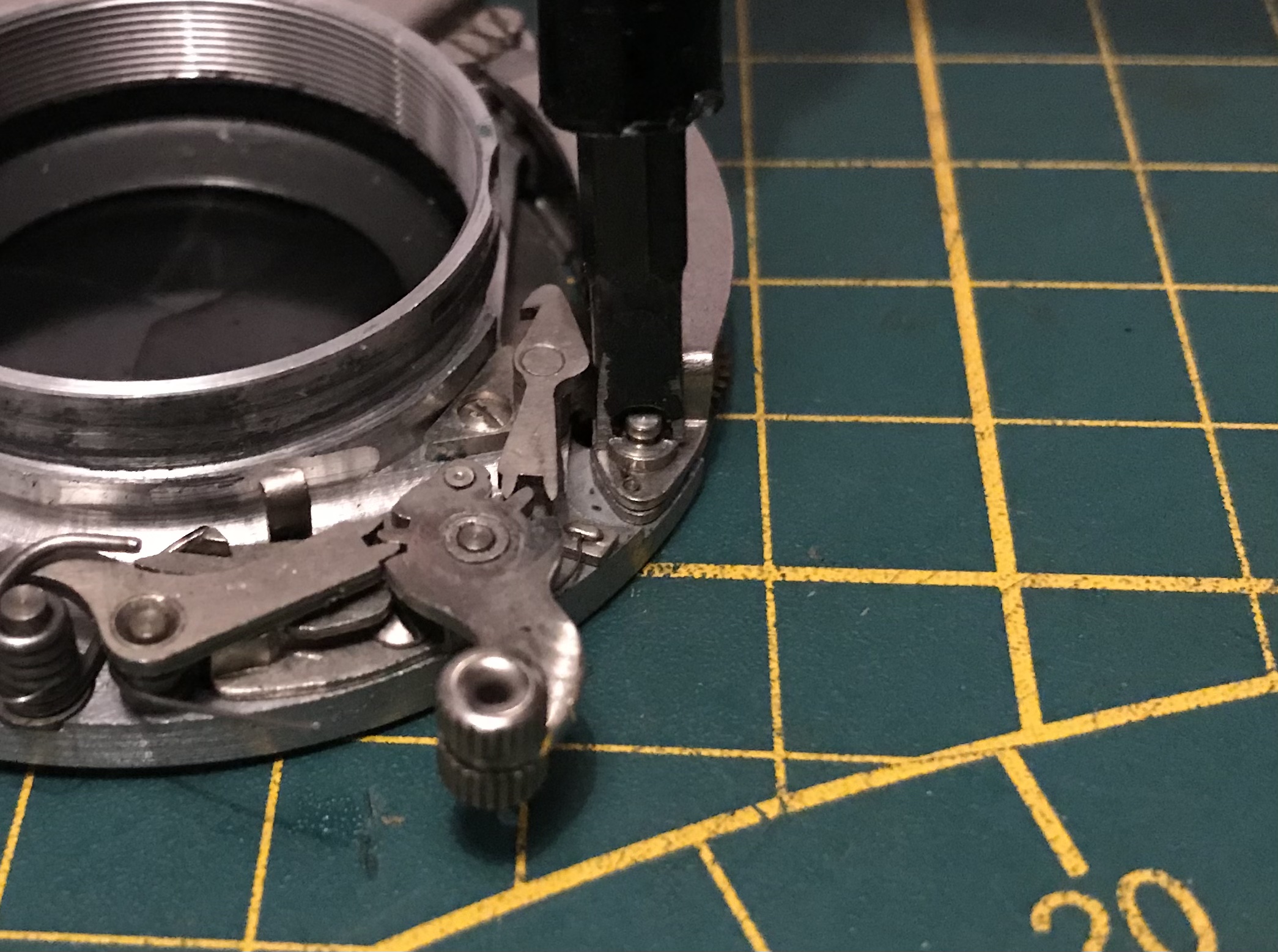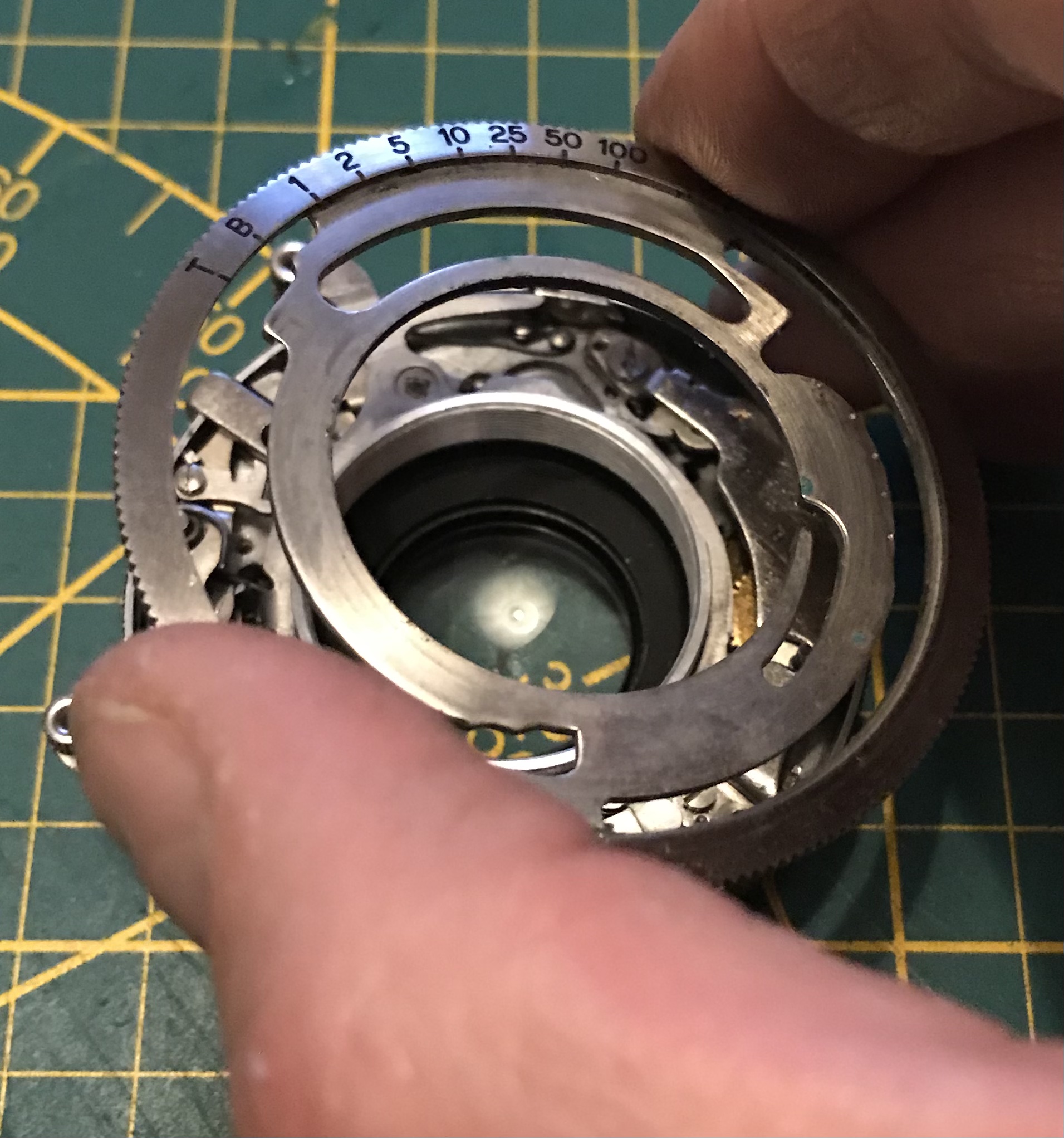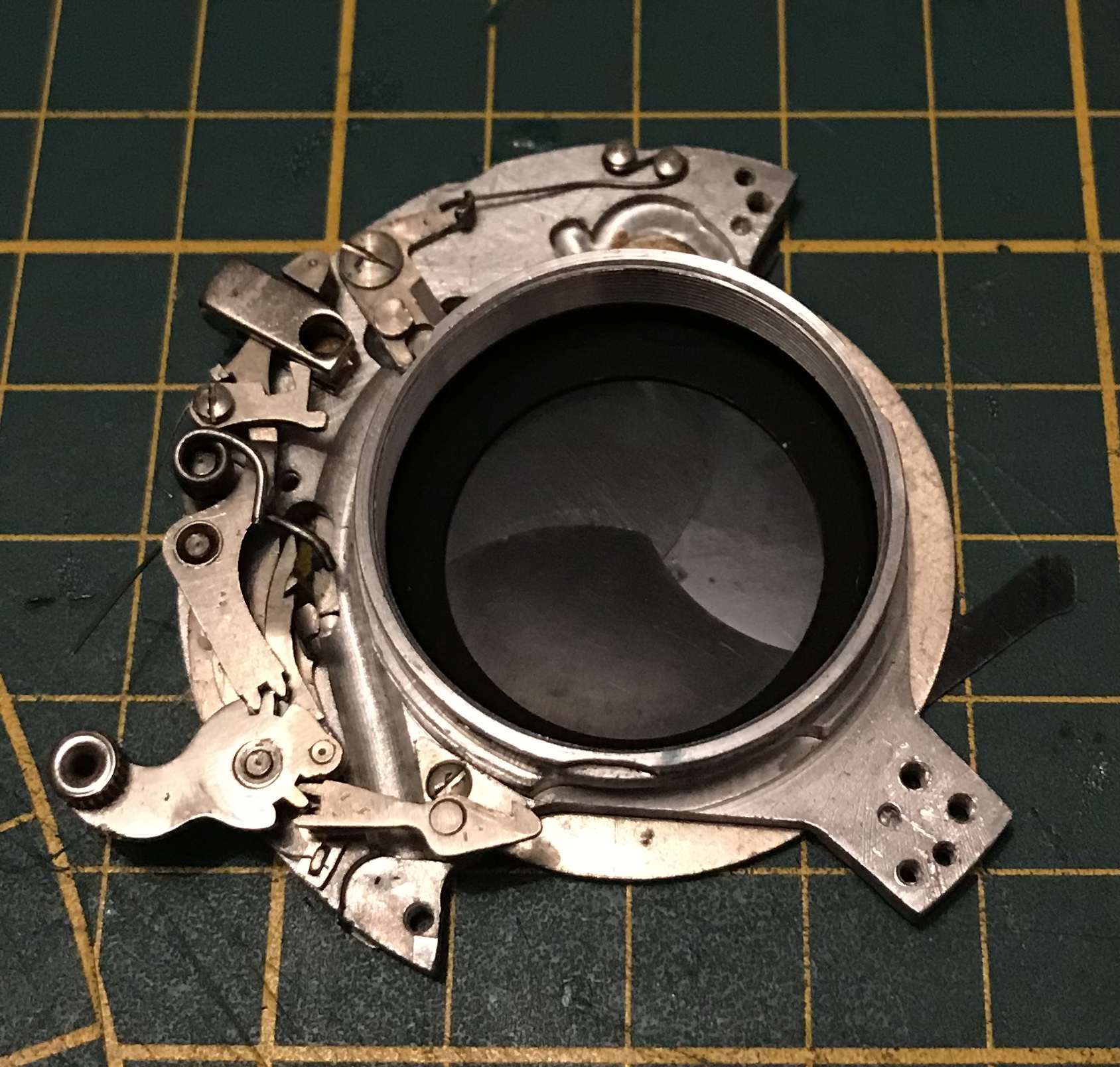 Weiter gehts. Wir haben den Verschluss nun soweit erforderlich zerlegt, sollten nun noch die Verschlusslamellen verölt sein lassen sich diese mittels der Schrauben auf der Rückseite abschrauben, reinigen und wieder montieren. (bei der Montage darauf achten dass die Nasen an den Verschlusslamellen wieder in die Öffnungen der Auslöserscheibe eingreifen.)