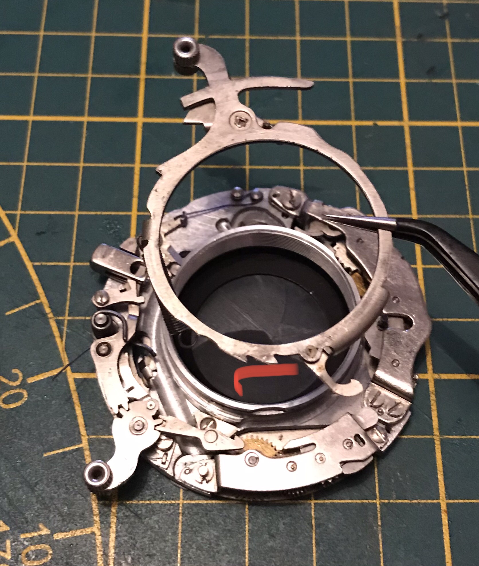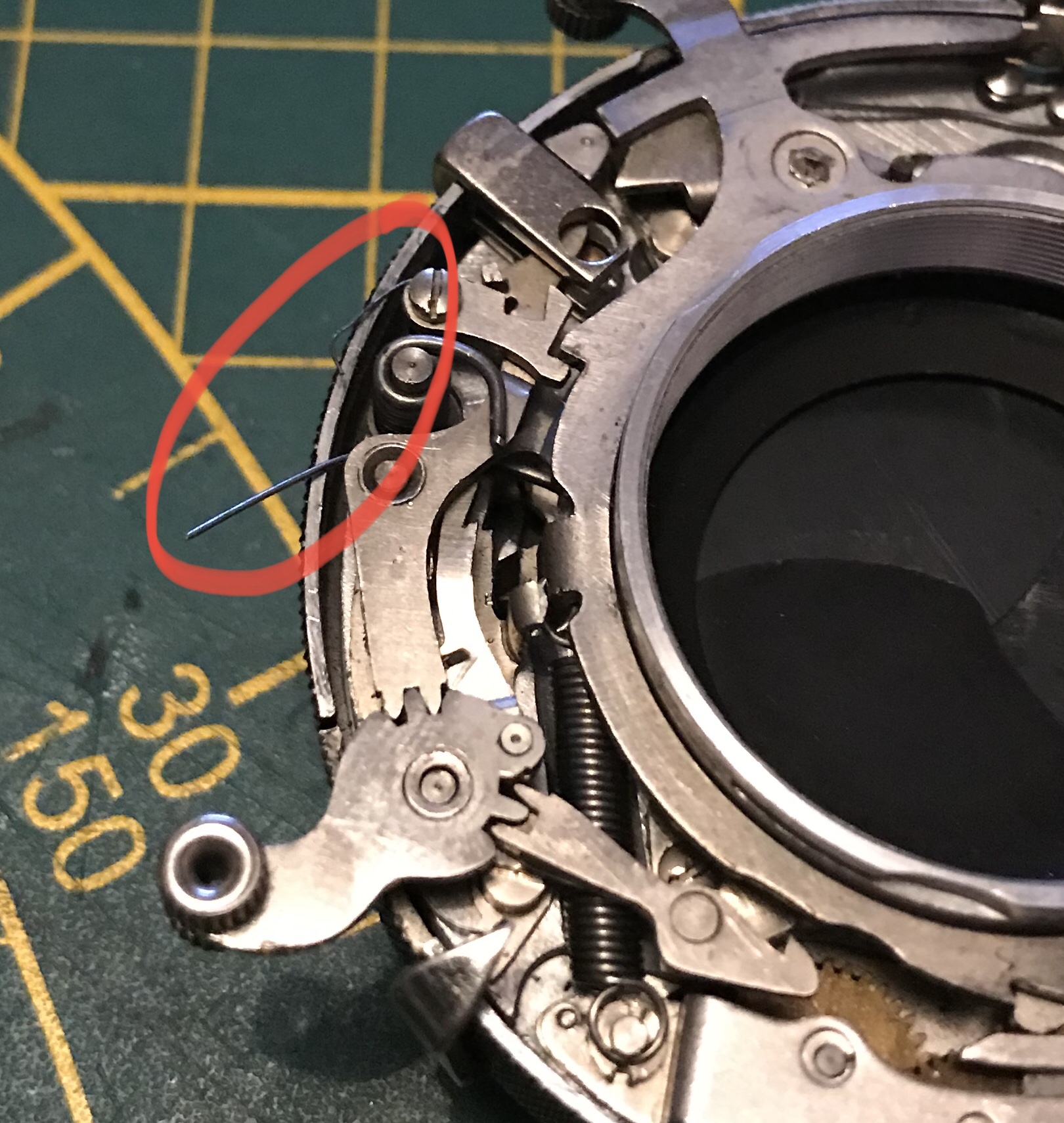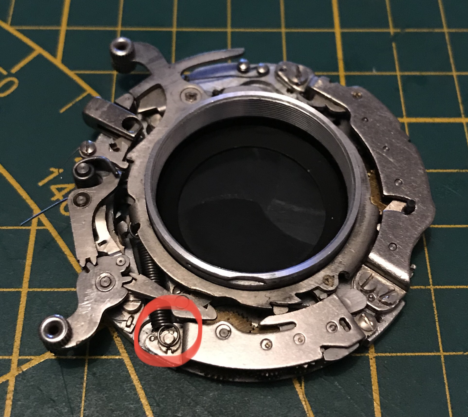 Jetzt müssen wir den Spannmechanismus des Verschlusses entfernen. Dazu mit Pinzette oder Schraubendreher die Feder an der eingekreisten Stelle von dem Haltestift abheben und entspannen, anschließend den Hebel mit Ring vom Objektivsockel abziehen. (Der rote Haken im letzten Bild gibt die nötige Stellung des Metallhakens an wenn man den Spannring später wieder montiert! Dieser Metallhaken stellt die Verbindung zum Vorlaufwerk her.)
