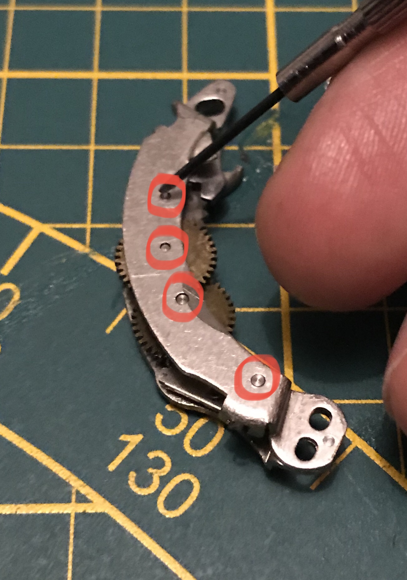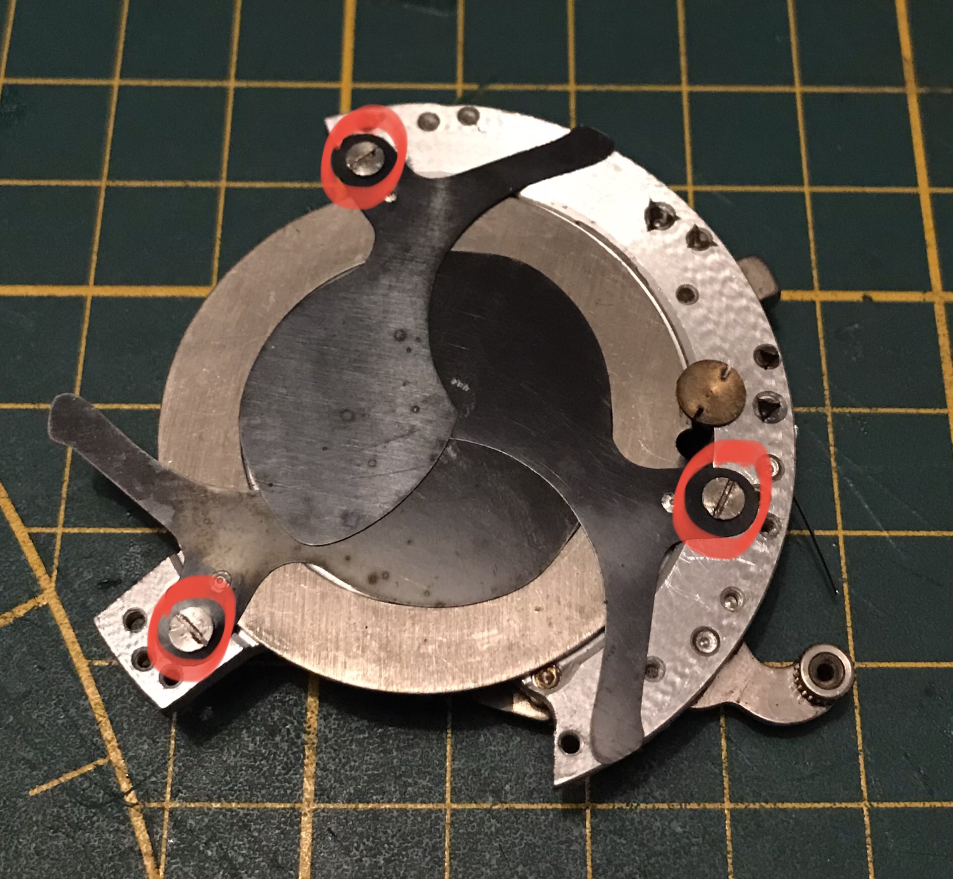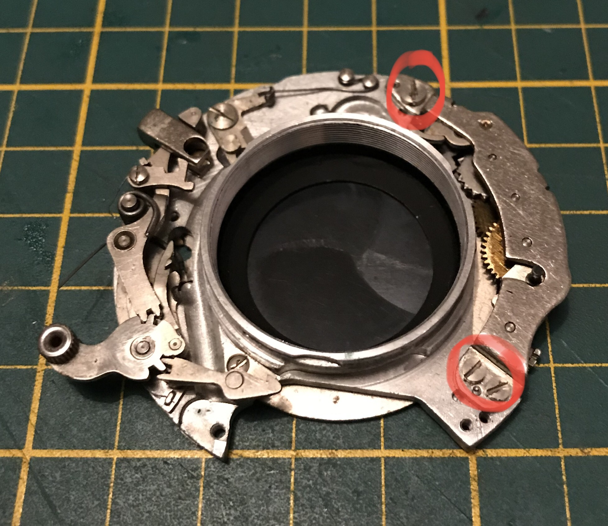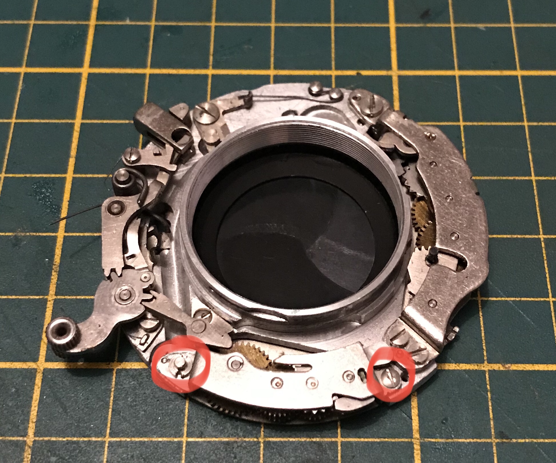 Der nächste Schritt besteht darin dass Vorlaufwerk und das Langzeitenwerk zu reinigen. Dafür lege ich es auf einen sauberen Lappen und pinsle es mit Spiritus ab. Nach dem Trocknen werden die Wellenlager an den eingekreisten Stellen geölt. Da diese Bauteile sehr nahe an den Verschlusslamellen sind darf nicht zu viel Öl eingesetzt werden. Ich nehme einen kleinen Tropfen Öl mit der Spitze eines Schraubendrehers und tippe damit nur auf das Wellenlager, das reicht völlig aus.