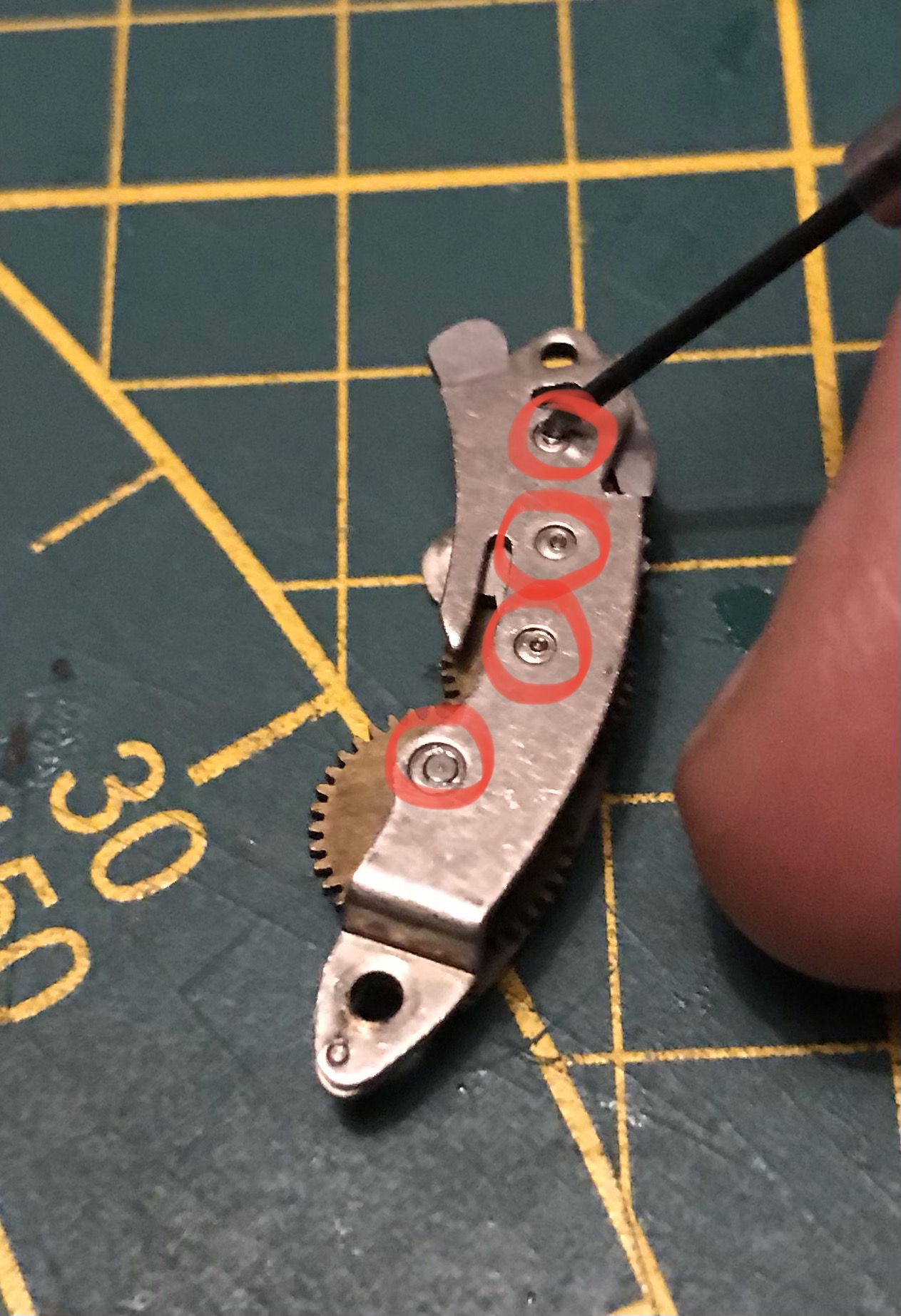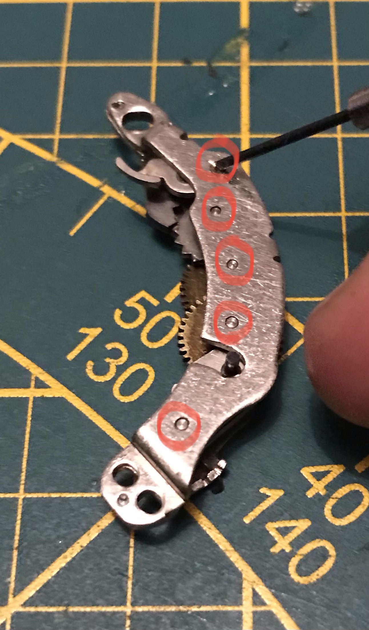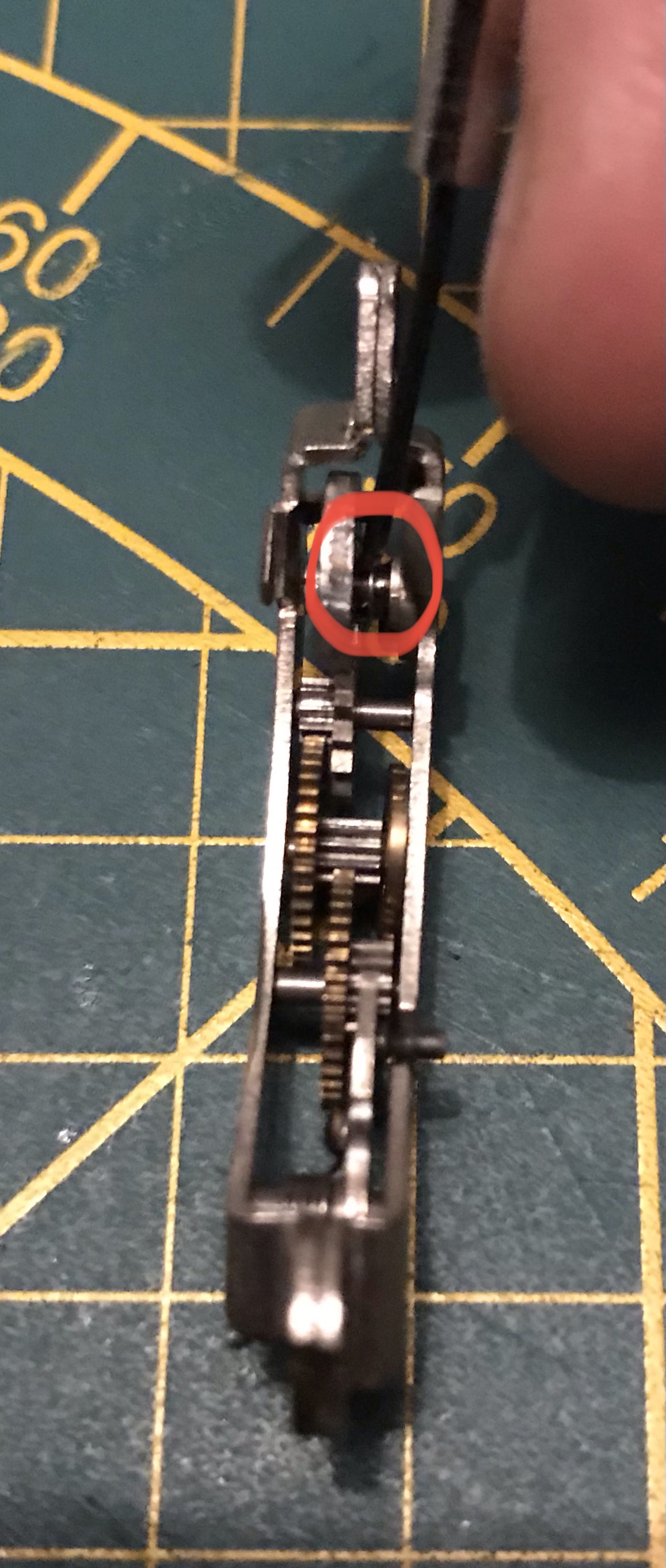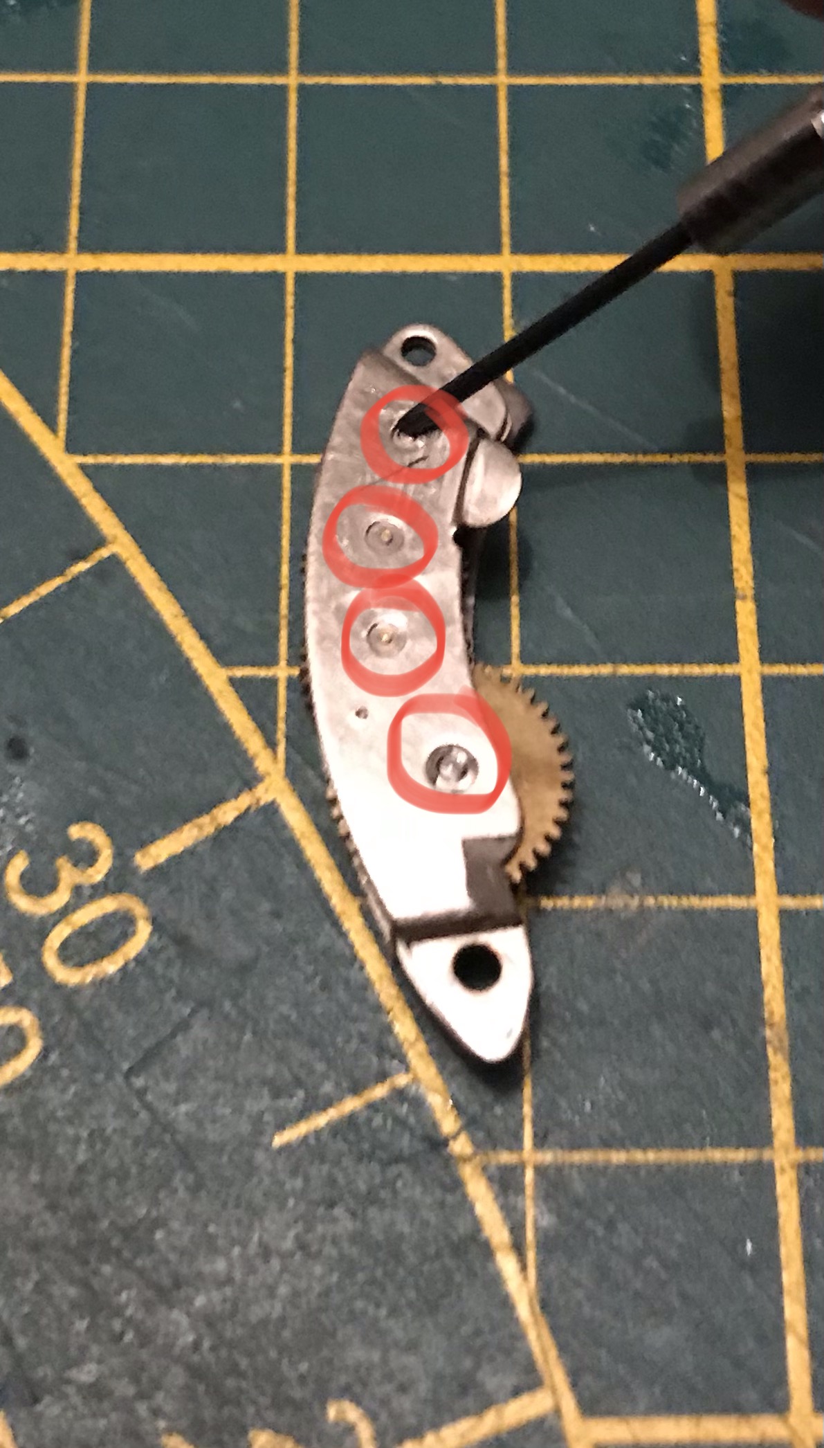 Der nächste Schritt besteht darin dass Vorlaufwerk und das Langzeitenwerk zu reinigen. Dafür lege ich es auf einen sauberen Lappen und pinsle es mit Spiritus ab. Nach dem Trocknen werden die Wellenlager an den eingekreisten Stellen geölt. Da diese Bauteile sehr nahe an den Verschlusslamellen sind darf nicht zu viel Öl eingesetzt werden. Ich nehme einen kleinen Tropfen Öl mit der Spitze eines Schraubendrehers und tippe damit nur auf das Wellenlager, das reicht völlig aus.
