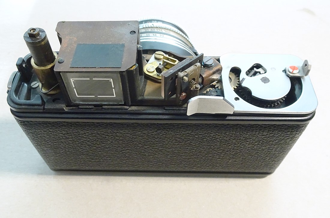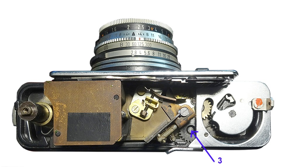 p.s. Zur Abnahme des Gehäuseoberteils sind 3 Gehäuseschrauben zu lösen: Links und rechts an den Seiten, eine hinter (verdeckt hinter dem Filmtransporthebel. Weiter muss der Rückspulknopf abgeschraubt werden, dabei nicht die Feder und Unterlegscheibe verlieren.