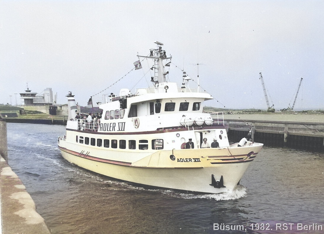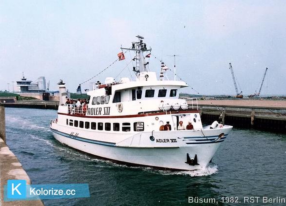 Nehme das Bild von der Adler VII bei der Ausfahrt von Büsum nach Helgoland. Hier bin ich der Meinung, dass die Kolorierung kaum fälscht oder gar ein Foto mit ganz anderer Aussage generiert. Das ist schon noch das fast identische Abbild der Lage um 1982, aber gefälliger anzusehen.