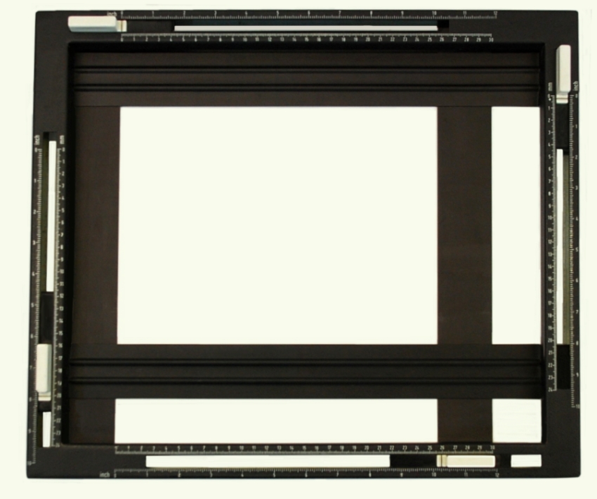 Der Vorteil der vier Maskenschieber: Der Rahmen konnten auf dem Labortisch unter dem Vergrößerer auch bei kleinen Bildern mitten-symmetrisch lagern. Bei Zwei-Maskenschieber-Rahmen verschob sich der Rahmen bei kleinen Bildern sehr zur Labortischseite.