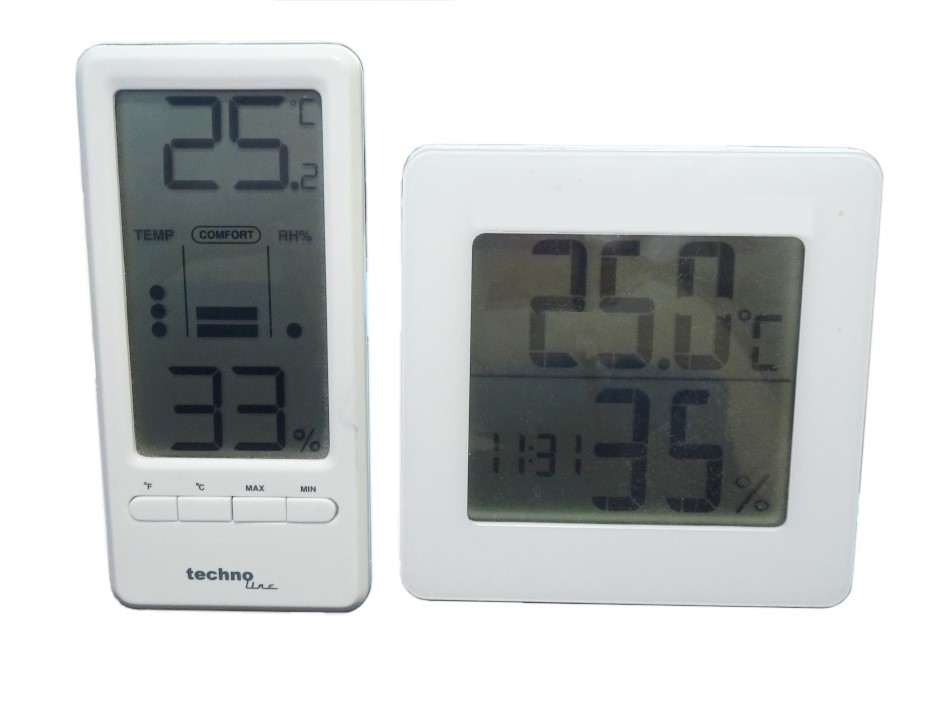 Einige meiner Vergleichsthermometer, die als Durchschnittswert-Referenz dienen. Der Vergleich wurde am selben Ort und Temperaturanpassung über 30 Minuten mit 6 Geräten parallel und dem klassischem Thermometer vorgenommen.