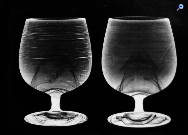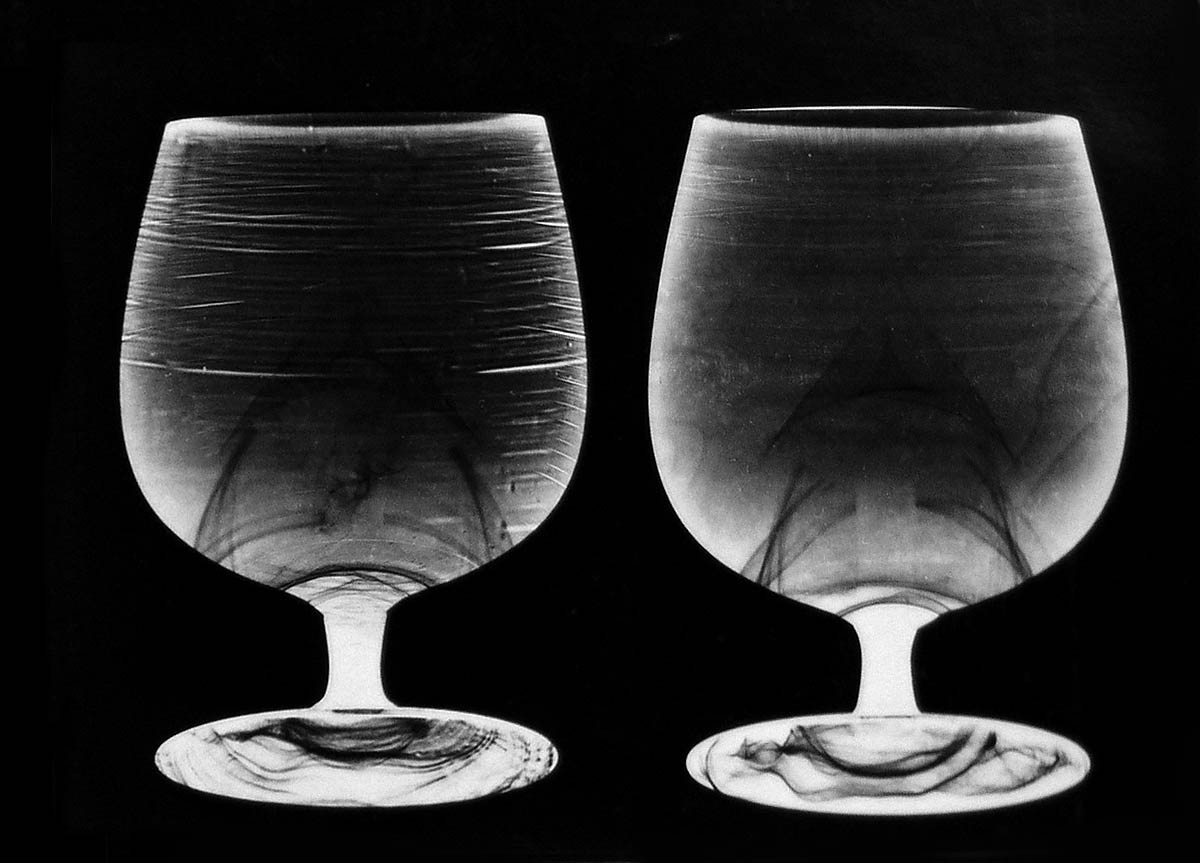 Da werden Erinnerungen geweckt! Bei mir war die Herstellung eines "Photogramms", wie diese Technik bezeichnet wird, die erste Tätigkeit beim Eintritt in die Berufschule für Photographen im Jahr 1961. Als Lichtquelle haben wir ein SW-Vergrößerungsgerät verwendet. Beim starken Abblenden des Objektivs erreicht man eine fast punktförmige Lichtquelle, wodurch auch dreidimensionale Objekte, wie die Weingläser auf meinem Photogramm von 1961, einen scharfen Schatten aufs Photopapier werfen.