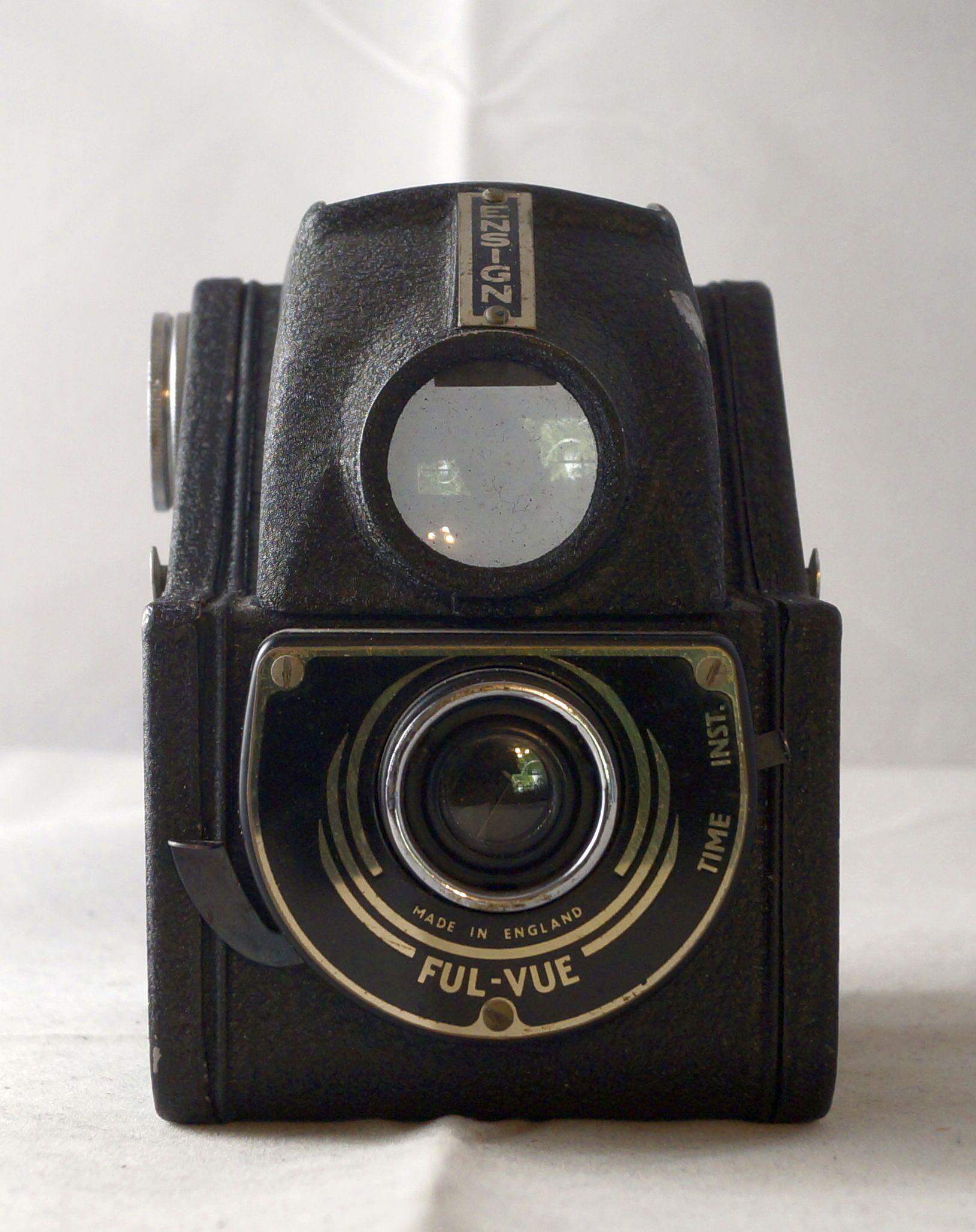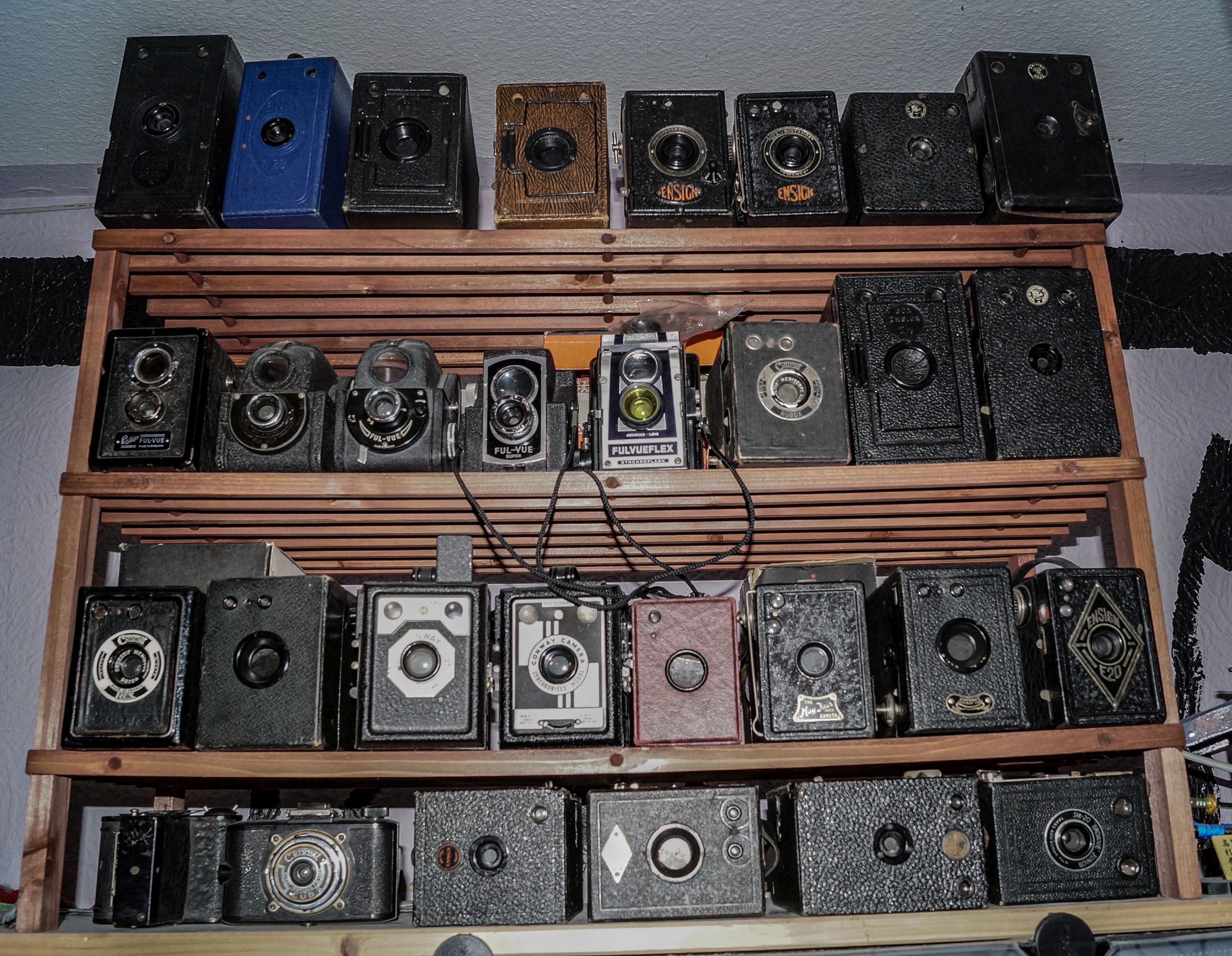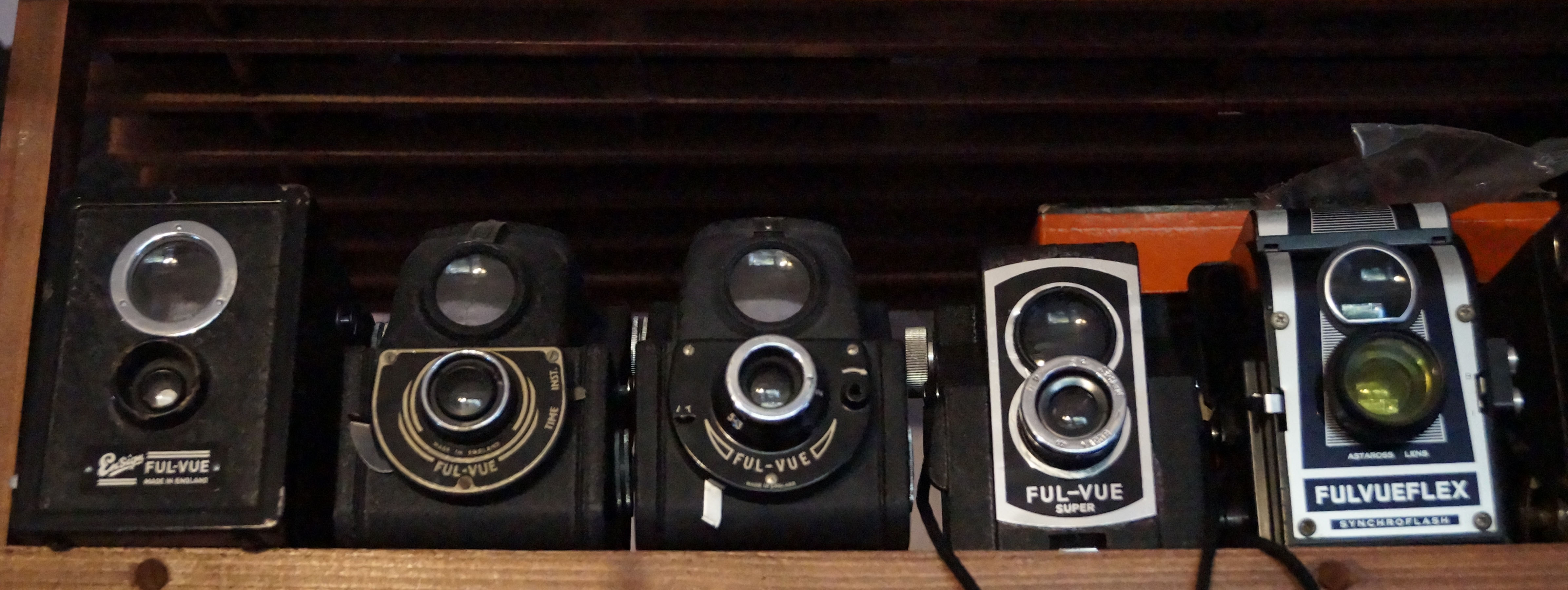 Hallo, heute konnte ich endlich meine Ful-Vue Familie komplettieren, angefangen von der ersten, noch Kastenförmigen, über die zwei frühen Modelle mit dem sehr eigenwilligen Design, bis hin zur Vul-Vue Super und Fulvueflex, leider muss ich sagen das die Flex nicht nur in Hinsicht des Baujahres den Abschluss der Familie darstellt, sie ist auch ein deutlicher Rückschritt zu ihren Vorgängern. Waren Vorher alle Ful Vue Kameras weitestgehend aus Metall und hatten ab Generation 3 eine, wenn auch recht einfache, Entfernungseinstellung. SO hat die Flex diese nicht mehr, und besteht vollständig aus Plastik, immerhin gab es einen passenden Gelbfilter und eine Portraitlinse. Ich werde in den nächsten Tagen Fotos und Daten für die einzelnen Kameras nachliefern, hier erstmal ein kleiner Vorgeschmack, sie stehen jetzt in trauter Gemeinschaft mit einigen meiner England Boxen.... ich brauche mehr Regalfläche ... wer hat da was von weniger Kameras gesagt?