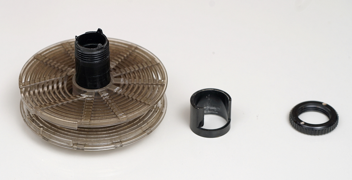 Hallo, Georg, aha, ich habe das nicht mehr genau in Erinnerung und meine 16/160 Jobo war auch für zwei Filme, 3 Spulen mit mindestens einem Zwischenstück für 120er Rollfilm und zweien für Kleinbildfilm mit Haken am Band für das Verfahren "Film zum Einspulen reinrutschen lassen, nicht schieben". Wenn meine Theorie stimmt, müsste auf dem untersten Foto Deines Beitrages der Abstand der Spulen für einen 16-mm-Film stimmen. Dann würde das Kleinbild-Zwischenstück (an dem der Haken auf dem Foto nicht auszumachen ist) oberhalb beider Spulen aufgeschoben werden, um die Lücke bis zu dem Gewinde zu schließen, auf das dann der Ring zur Fixierung aufgeschoben wird. Ich glaube, ich hatte das zum Entwickeln des winzigen Rollfilms einer 16-mm-Petitux gehabt (https://blende-und-zeit.sirutor-und-compur.de/thread.php?board=2&thread=25). Sorry an die Nachwelt, die den Link in spätestens ein paar Wochen ungültig finden wird, aber hier ist der Film abgebildet, in Versteigerung mit einer Tuximat: https://www.ebay.de/itm/144248506862?hash=item2195e189ee:g:NdUAAOSw6lthachz . Der Verkäufer hat unter seinen Aufnahmen auch eine - im Original riesengroße - Ansicht der Filmführung, noch mit einer Mini-Rollfilm-Spule drin.