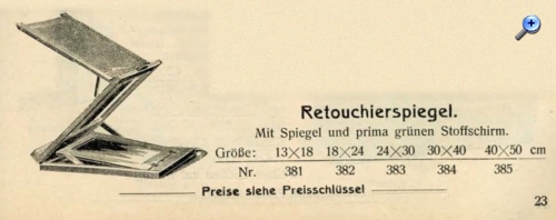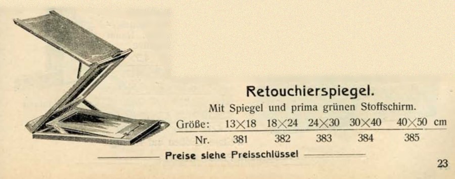 Auf der Werbeanzeige kommt das Tageslicht von rechts und durchleuchtet das Negativ auf der schrägen Mattscheibe. Damit man auf dem Negativ was erkennt, ist noch eine Holzscheibe zum Abschatten drüber.