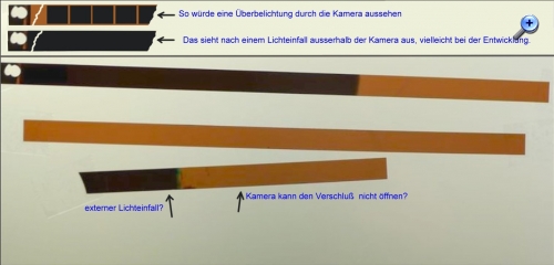 1) Externer Lichteinfall, den nicht die Kamera zu verantworten hat, auf einen Teil des Films.