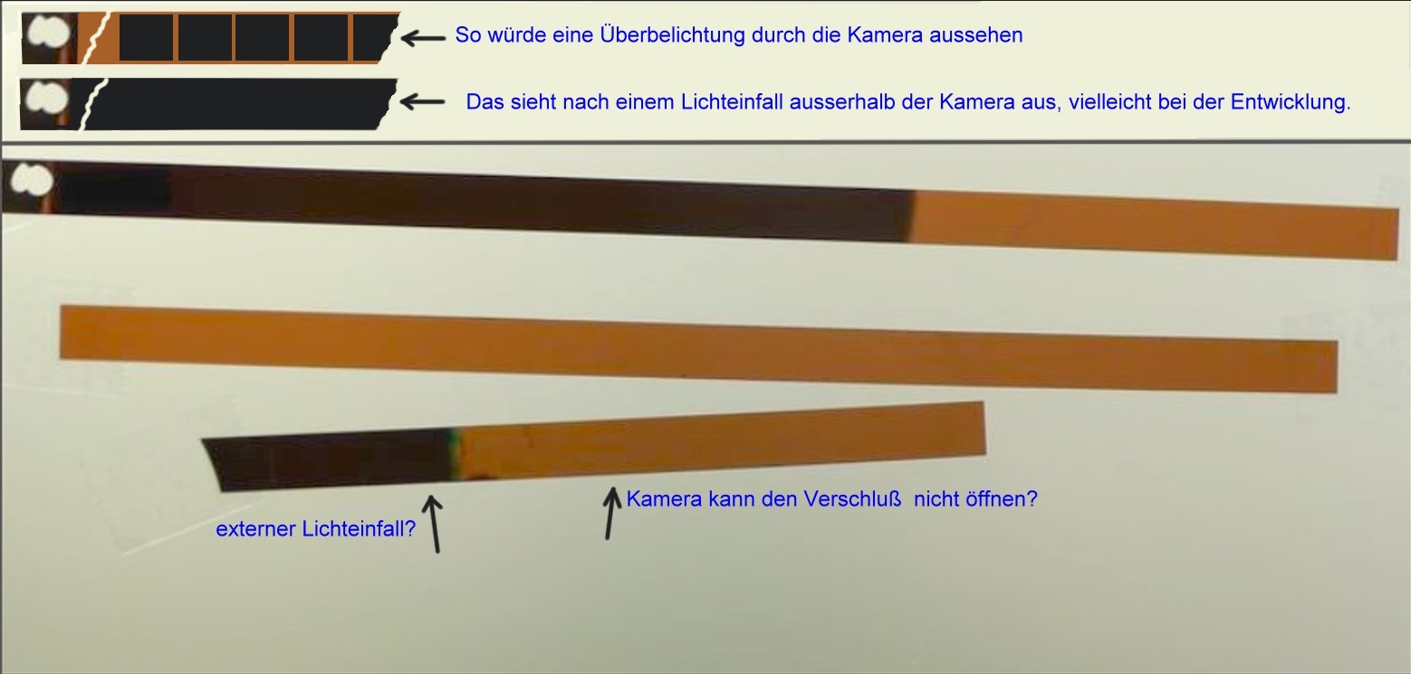 Was mich stutzig macht, dass die erste Hälfte des Films flächig, auch ausserhalb der Bildfenster voll Licht bekommen hat, die zweite Hälfte gar kein Licht. Irgendwie passt das nicht zusammen. Wäre die Kamera in Ordnung, müssten in der zweiten Hälfte Bilder zu sehen sein. Vielleicht gab es zwei unabhängige Probleme, Entwicklung und Kamera...