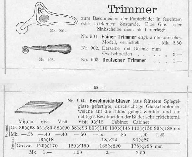 auch ich habe diese Schneidegläser in Katalogen immer irgendwie überlesen. Eigentlich eine ganz praktische Lösung, weil man gut die Scheibe so platzieren konnte, wie man den Bildausschnitt haben wollte. Auch die Trimmer-Schneid-Rollmesser passen dann gut dazu.