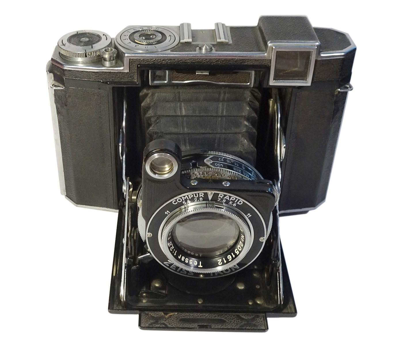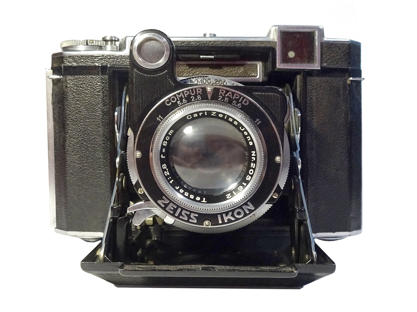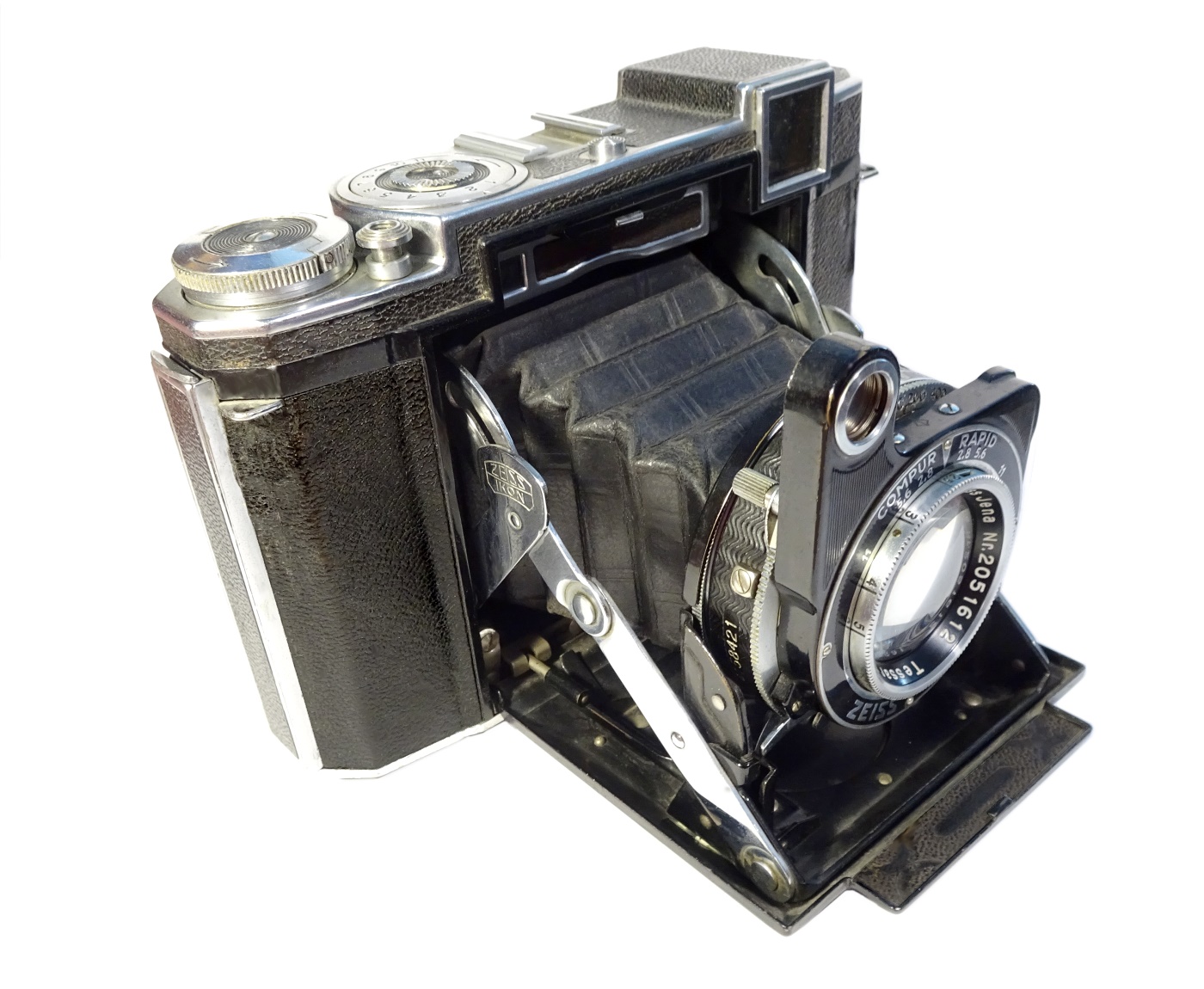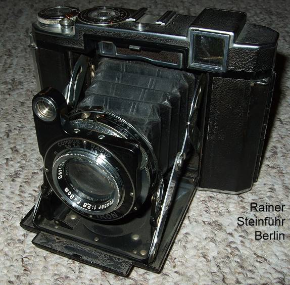 Belichtungssystem: Verschluss Compur Rapid. Muss unabhängig vom Filmtransport aufgezogen werden. Doppelbelichtungssperre, Anschlußösen für Trageriemen ***