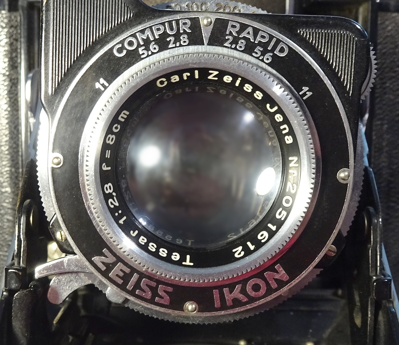 Objektiv: Carl Zeiss Jena Tessar (das Adlerauge) 1:2,8, 80 mm Brennweite. 1,6 Meter (!!!) - unendlich. Nr. 2051612. Eingestellt wird mit einem kleinen Rad vorn neben dem Objektiv.