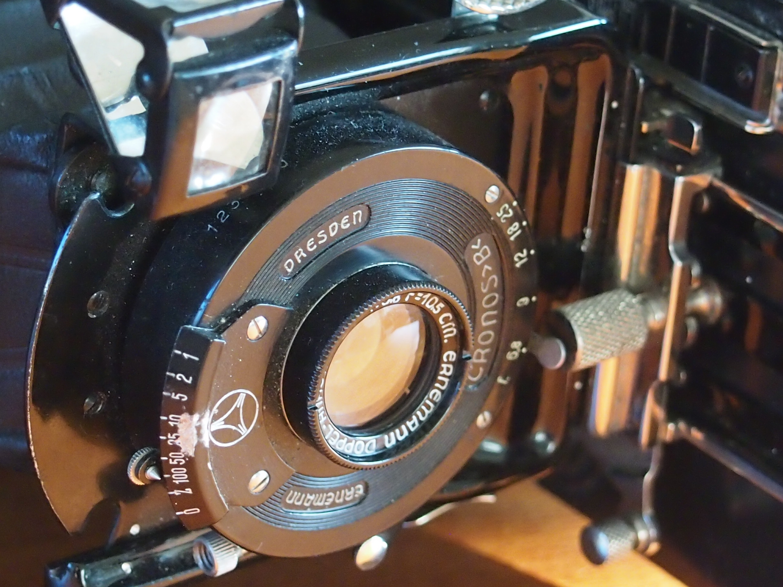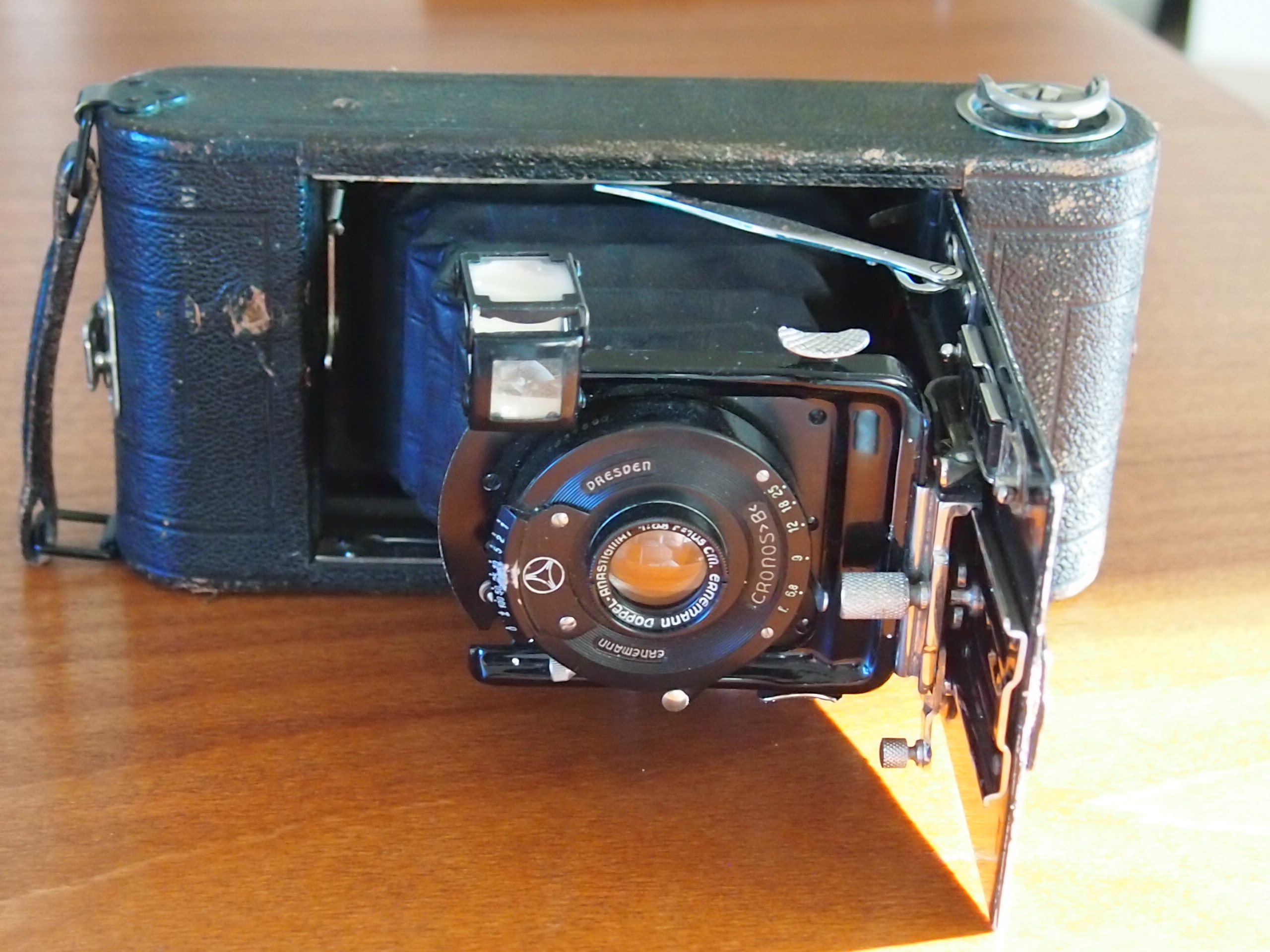 ich bin neu in diesem Forum und hoffe, einige Tips zur oben erwähnten Kamera zu bekommen, die ich kürzlich geschenkt bekommen habe. Es handelt sich um eine Ernemann mit der Bezeichnung Cronos B. Das Objektiv ist ein Doppel Anastigmat mit einer Brennweite von 10.5cm (1:6.8). Zeiten funktionieren und die Linse zeigt keinerlei Staubeinschlüsse und ist glasklar. Ich möchte sie jetzt zu neuem Leben erwecken, habe aber keinerlei Erfahrungen/Ahnung mit diesen Vorkriegsmodellen (ich habe lediglich die Agfa Box und die Agfa Billy Rekord genutzt). Meine Erfahrungen liegen mehr in den Nachkriegsmodellen und ich nutze regelmäßig die Kodak Retina 1a und die Rolleiflex 3.5F. In der Internet Recherche wird diese Kamera als Plattenkamera bezeichnet. Aber es kann eindeutig ein normaler Rollfilm eingelegt werden?? Hierzu fehlt mir allerdings ein "Filmhalter" in den die Rolle eingelegt werden muss. Frage 1: Kann mir jemand weiterhelfen und mir Tips geben wo ich einen solchen Filmhalter bekommen könnte - gibt es in der Community Jemanden der aushelfen kann/so etwas verkaufen würde? Mir ist auch die Funktionsweise des Filmetransports noch unklar. Zwar lässt sich ein Film traditionell per Knopf transportieren, aber es gibt keinerlei Anzeige die mir zeigt (wohl 6x9 Format), ob das nächste Foto bereit ist? Am Rückteil der Kamera befindet sich allerdings eine Klappe mit einem kleinen Faltsack. Diese Klappe gibt natürlich den Blick zur Filmrückseite frei - aber damit würde ich den Film ja belichten? Frage 2: muss ich mir das so vorstellen, dass beim Filmtransport die Kamera mit einem lichtdichten Tuch (über dem Kopf) geschützt werden muss - aber dann wäre es ja wieder so dunkel, dass ich die Filmnummerierung nicht ablesen könnte?! Also die simple Frage: wie funktioniert das?