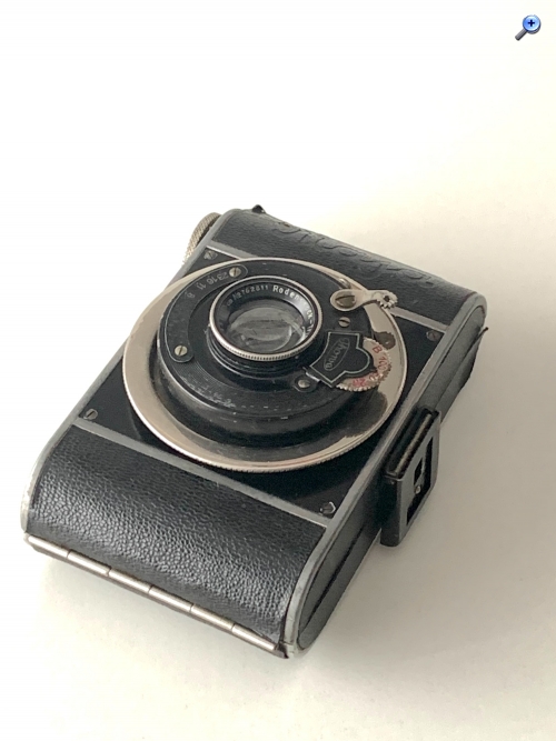 Bestückt ist die Kamera mit einem Friedrich Corygon 4.5/50 in einem Vario-Verschluss mit zusätzlichem Fadenauslöser. Dies ist, wie Jan schon erwähnte, die einfachste Ausstattungsvariante, die Thowe in der Liste H (1932) anbot. Als Sucher dient (im Unterschied zur Maja von Jan) ein klappbarer Newtonsucher.