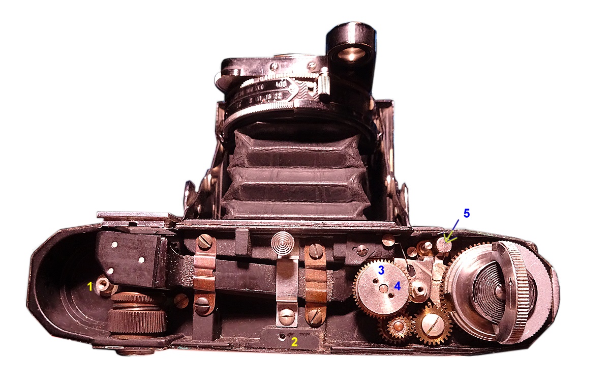 Zum Fehler selbst: Ursache war Verharzung bzw. das Verschwinden von Schmierung an einigen Getrieberädern und Vermittlungshebeln der Zählwerkmechanik und Filmtransport-Sektion. Eine Entfettung, wo man rankommt und zarte Neufettung mit einem Feinmechaniker-Fett brachte baldige Abhilfe. Aber Vorsicht: Nicht alle Teile sind zu ölen / fetten. Letzte Reste von Schmierstoffen geben Hinweise auf zu behandelnde Stellen.