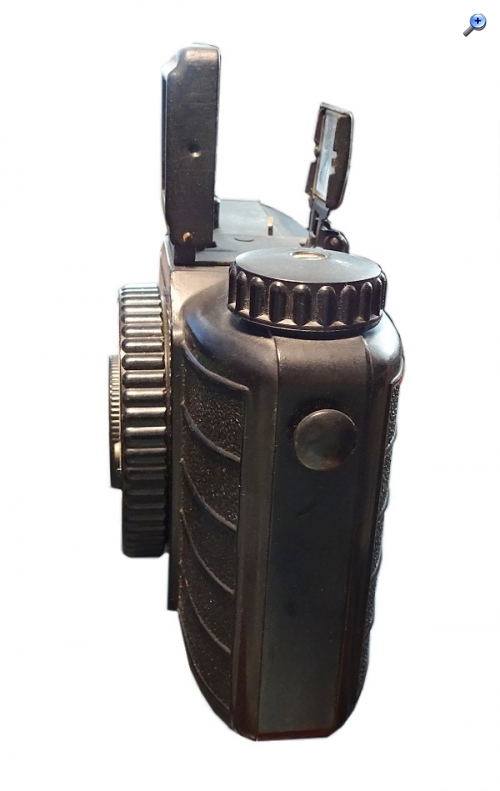 3. schwarzes Gehäuse, Klappsucher, Alunieten zur Riemenbefestigung, Frontschild Metall Silber, schwarze dünne Schrift gedruckt, Selbstauslöseranschluss Alu