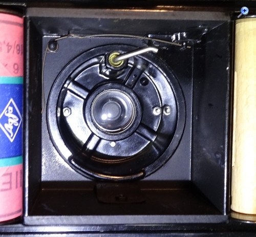 Hier ist die Objektiveinheit herausgedreht. Man kann sehen, wie der Auslöser über eine Stange mit Feder nach vorn wirkt.